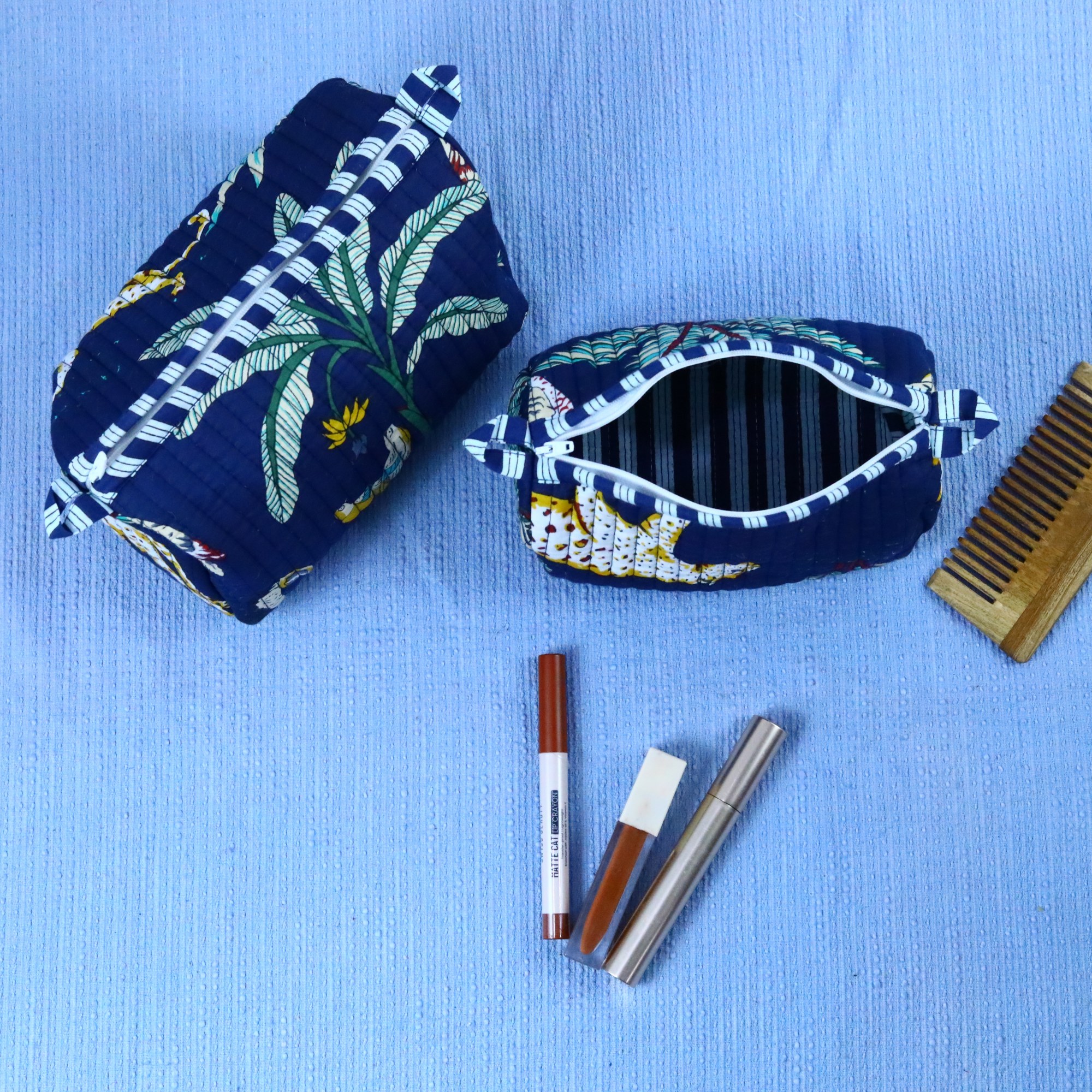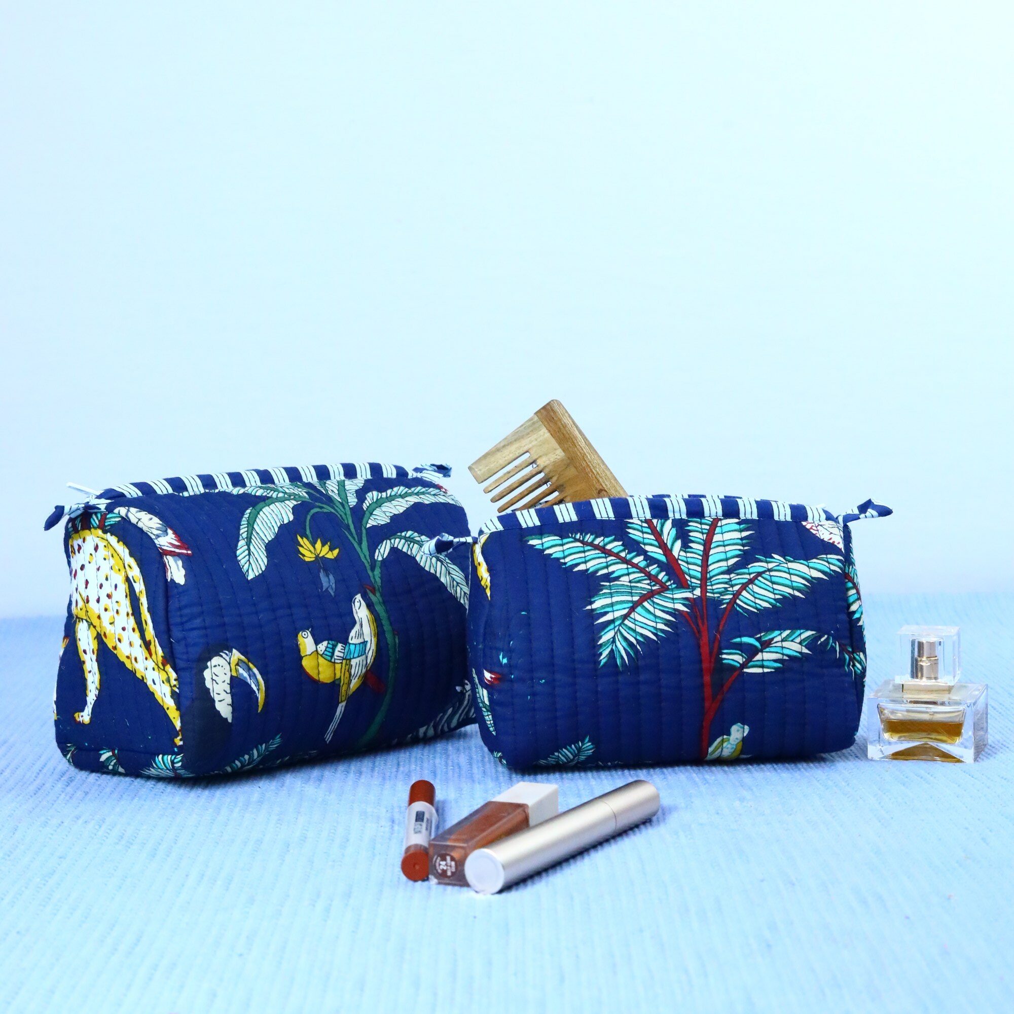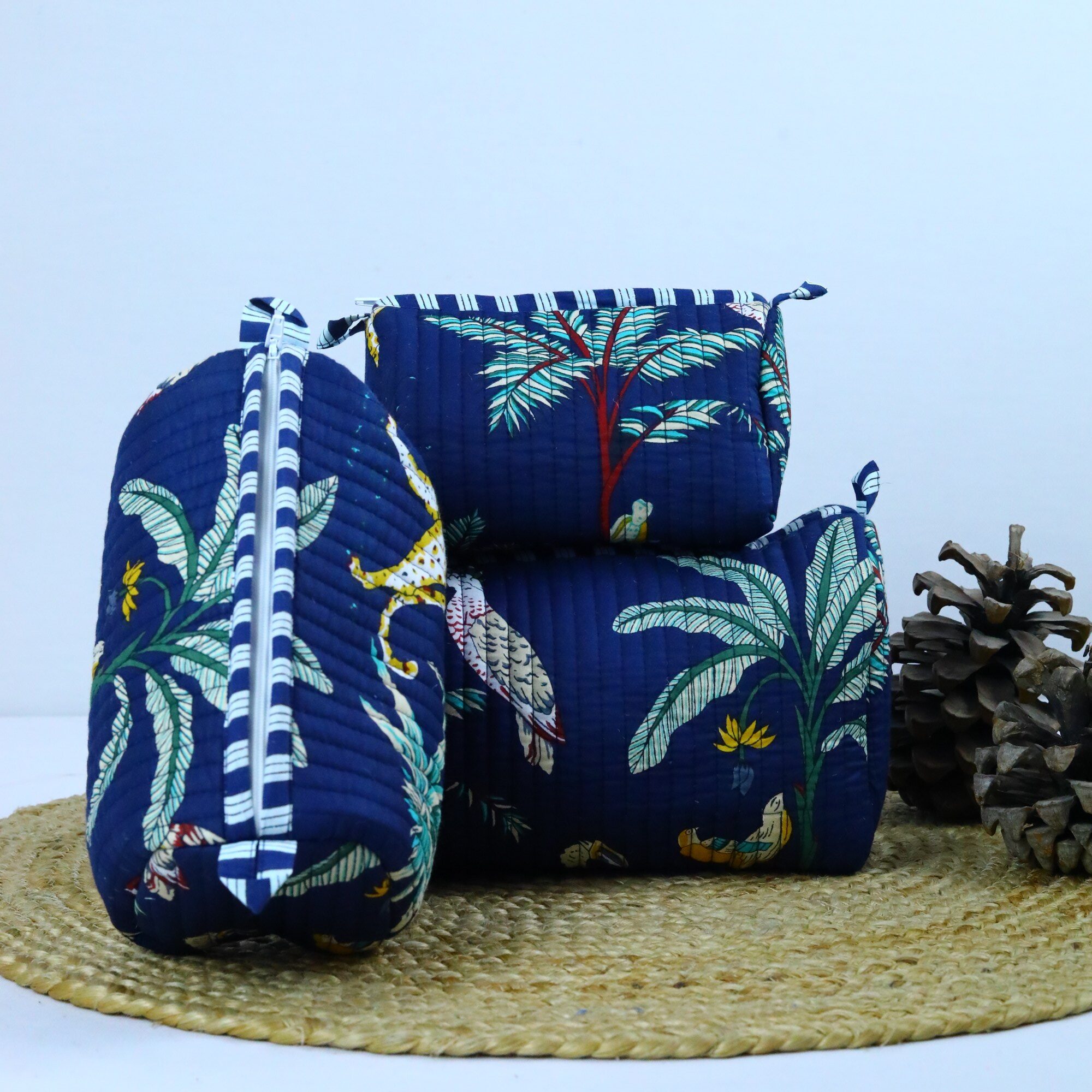 This charming set of 3 cotton quilted toiletry pouches is perfect for organizing your travel essentials in style. Each pouch is handcrafted with care, featuring a unique block printed design that adds a touch of artistry to your travels. These pouches will add a touch of elegance and practicality to their adventures. A thoughtful and lasting gift that reflects your care and appreciation.