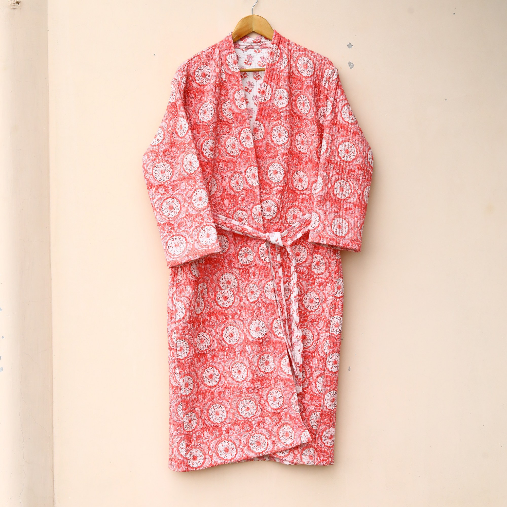Be the first to review “Blush Bloom Block Printed Cotton Quilted Kimono In Peach With Spacious Pockets”