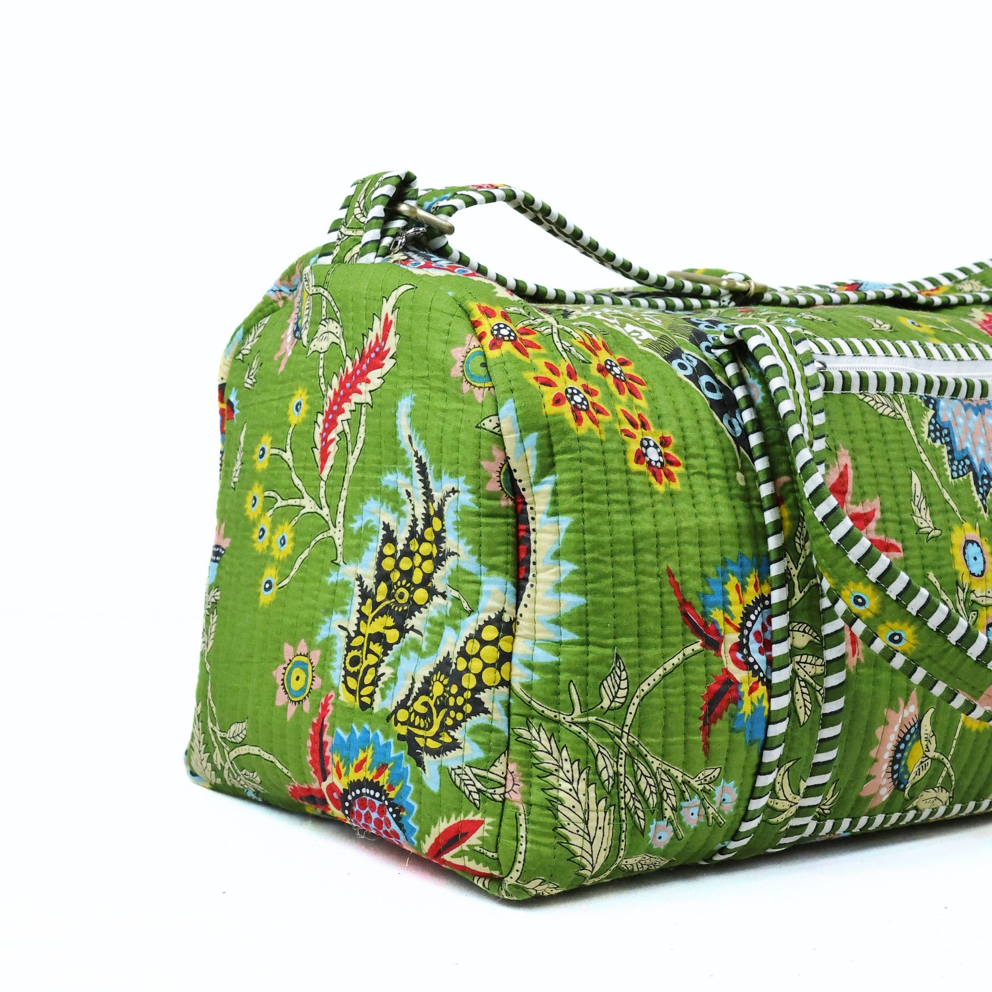 Botanical Green Screen Printed Cotton Quilted Duffle Bag With Sturdy Handle