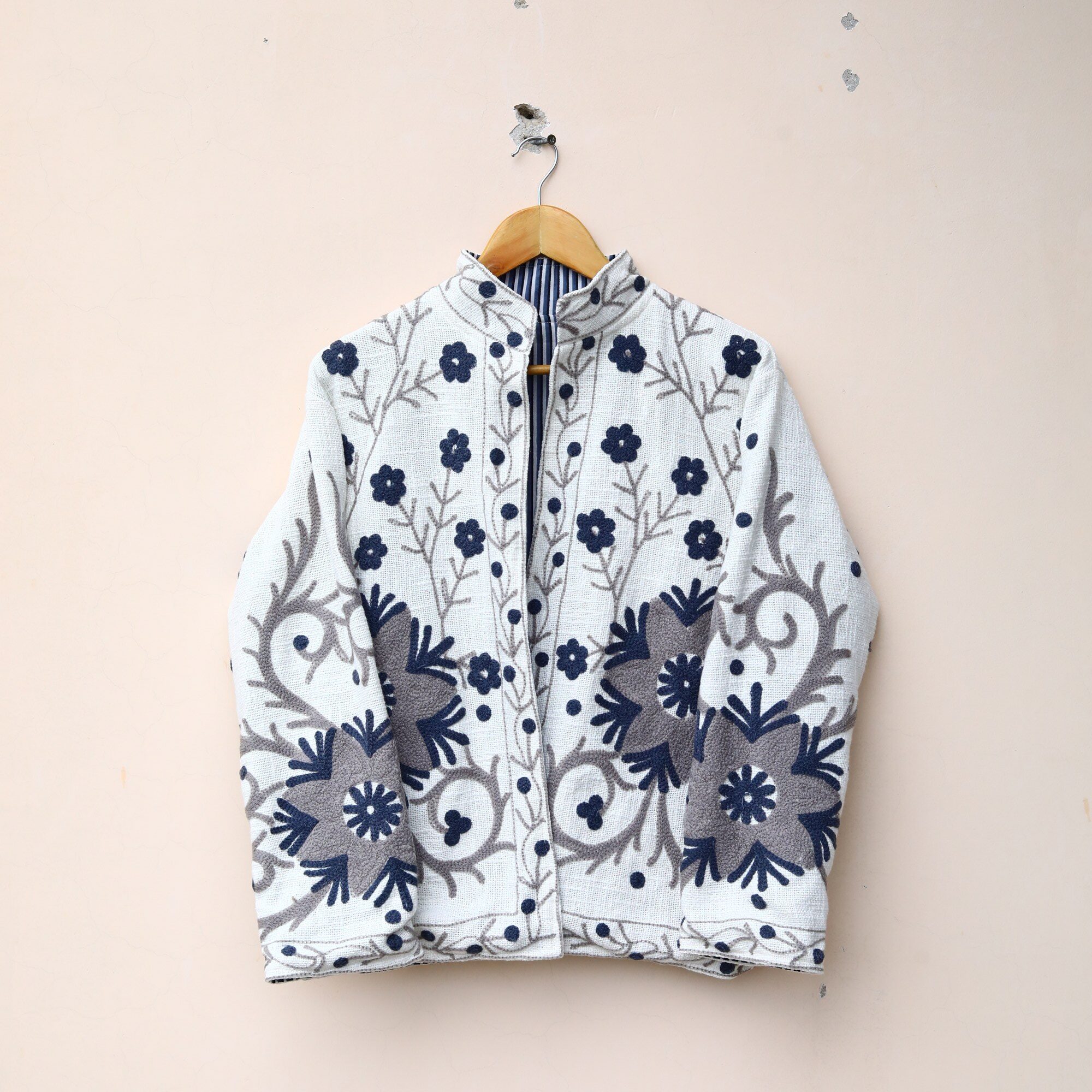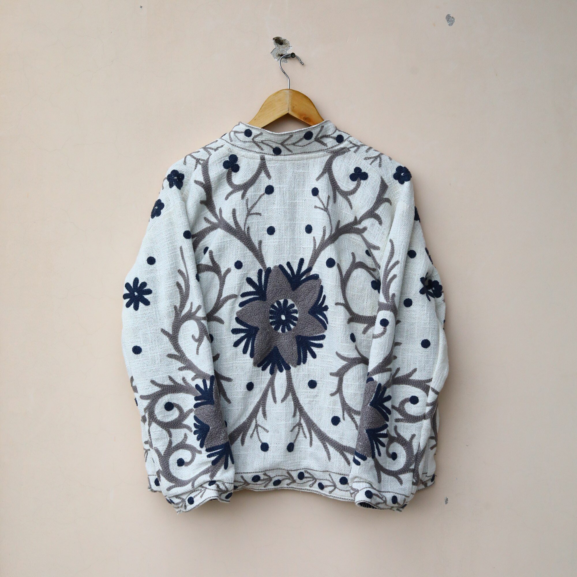 Embrace timeless elegance with this stunning Suzani embroidered kimono-style Urbek jacket. Crafted with intricate Suzani embroidery, a traditional Uzbek textile known for its vibrant colours and bold patterns, this jacket is a true work of art.