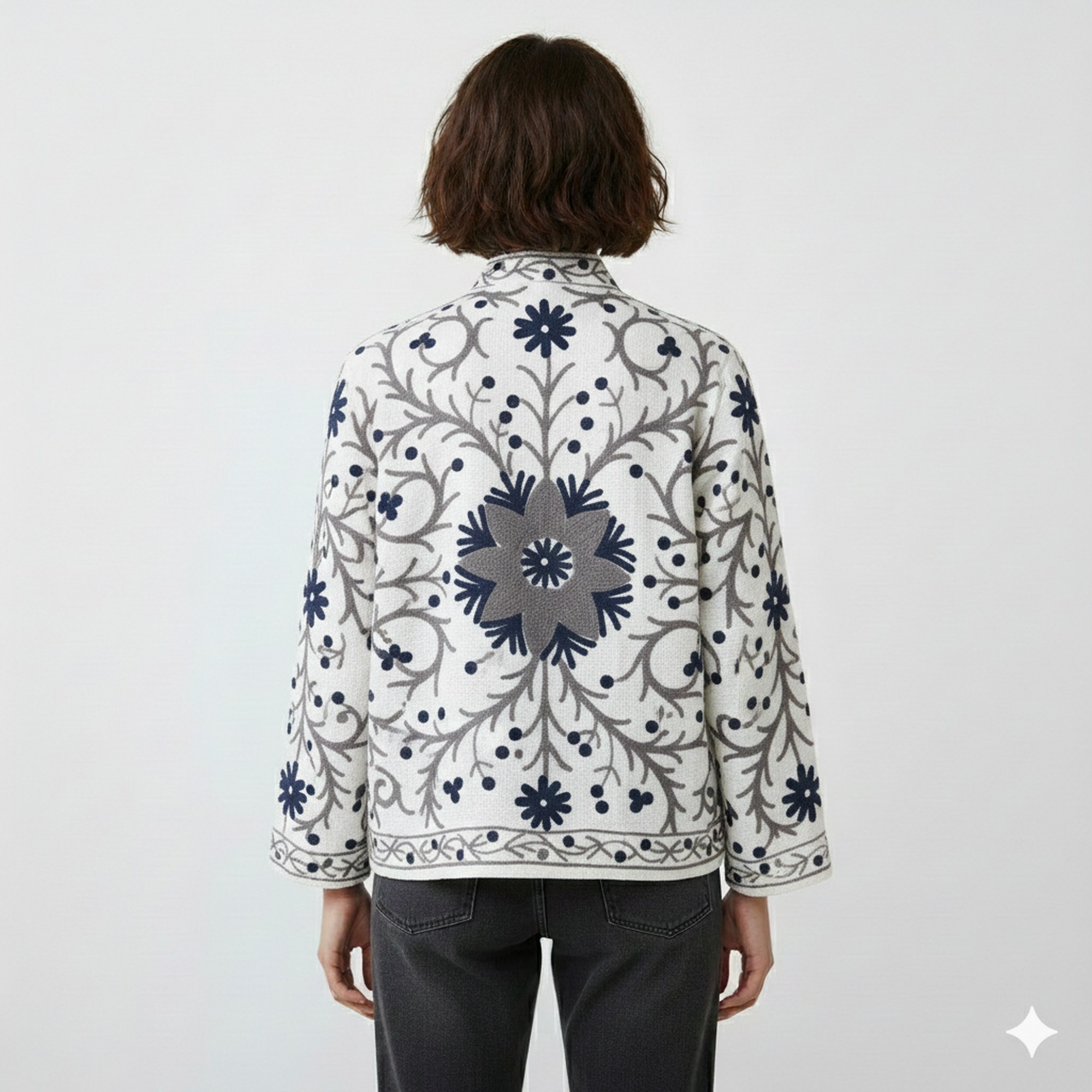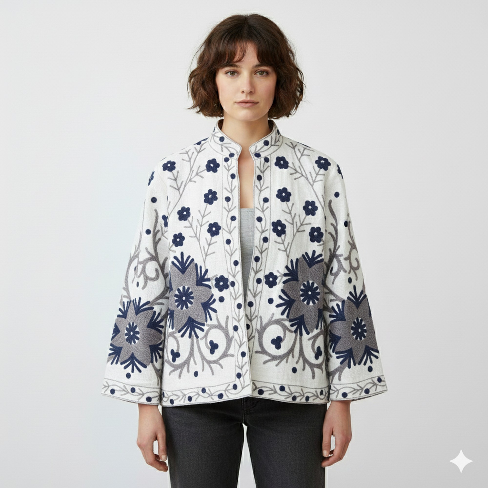 Experience the beauty and versatility of this Suzani embroidered kimono-style Urbek jacket.