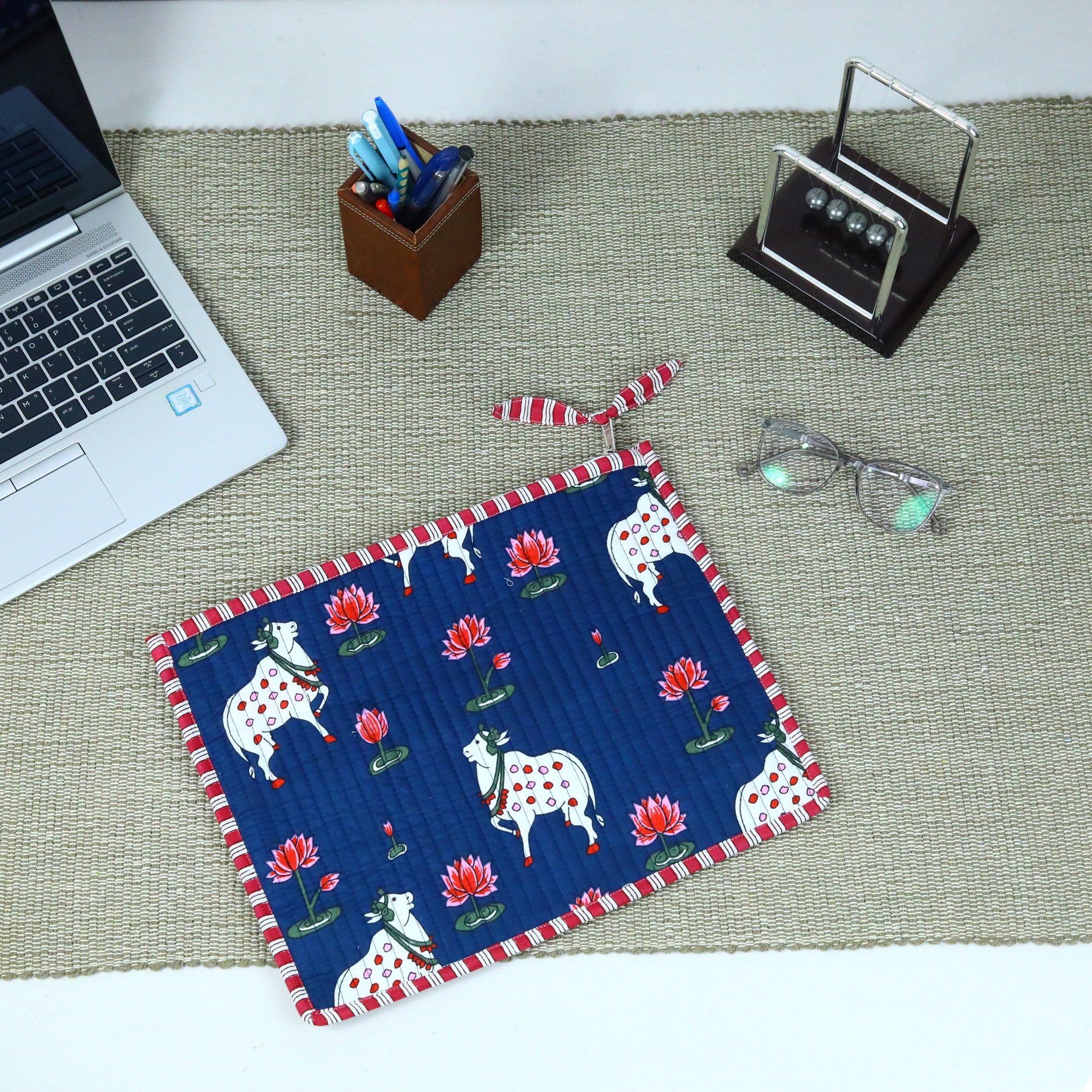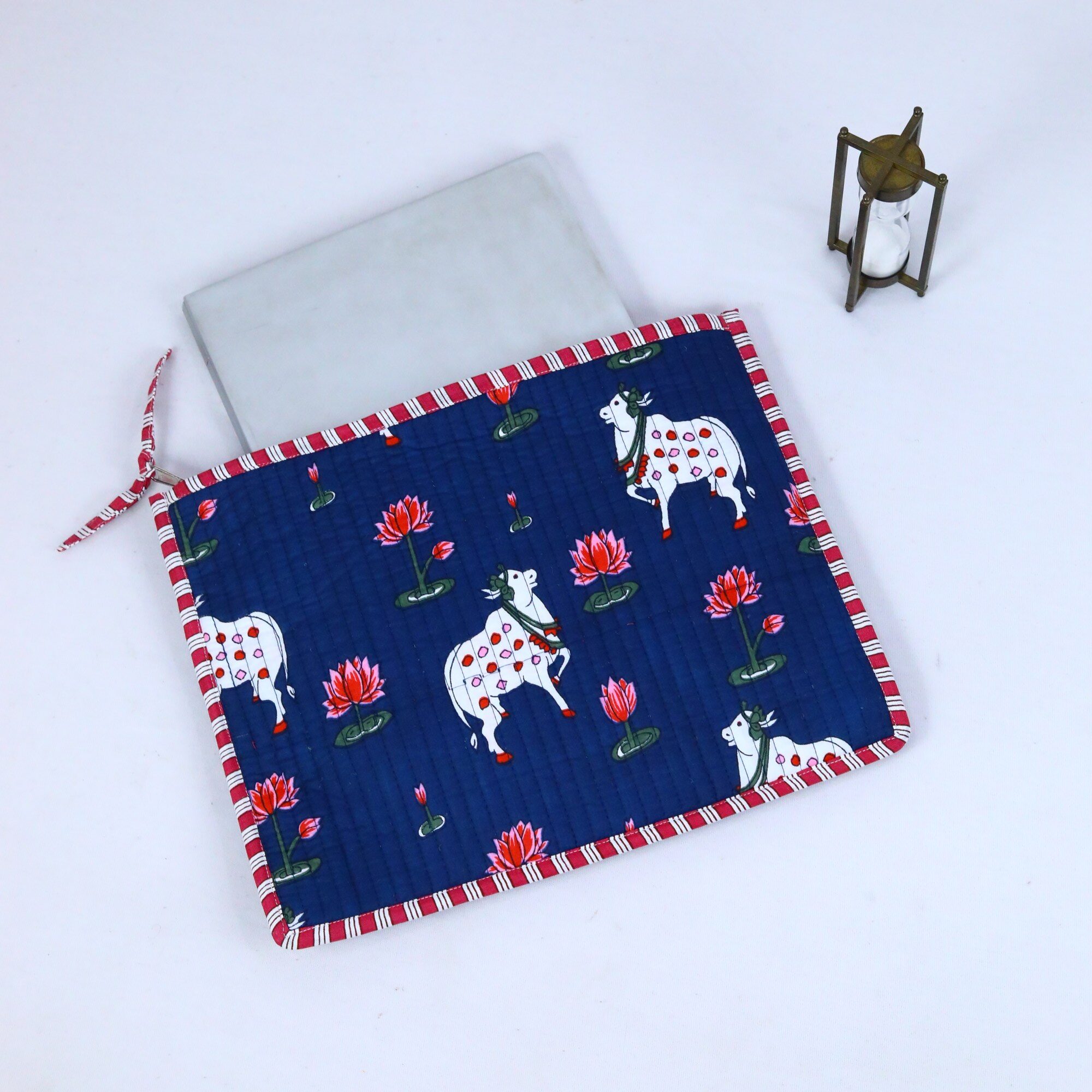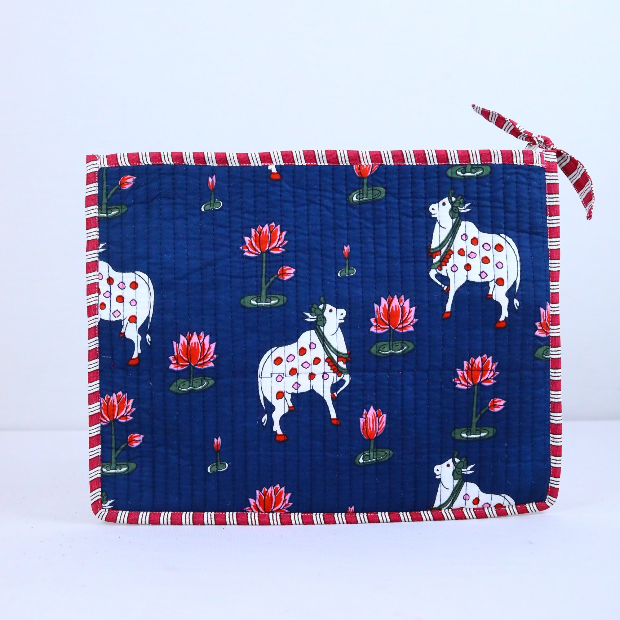 Floral & Cow Cotton Quilted Screen Print Laptop Sleeves With Bow