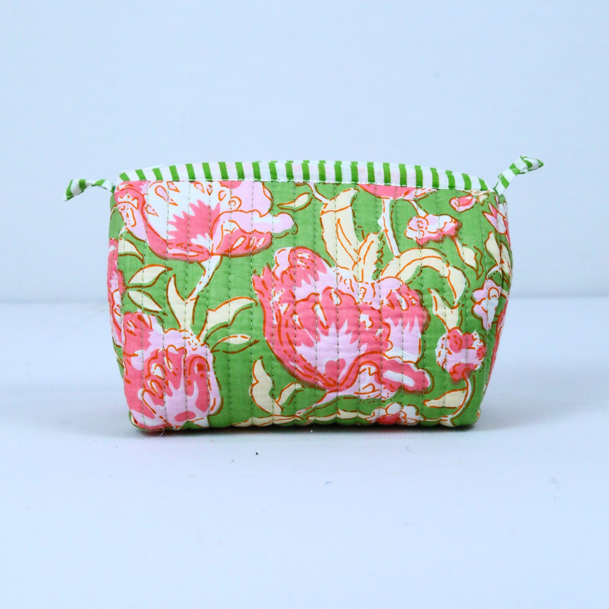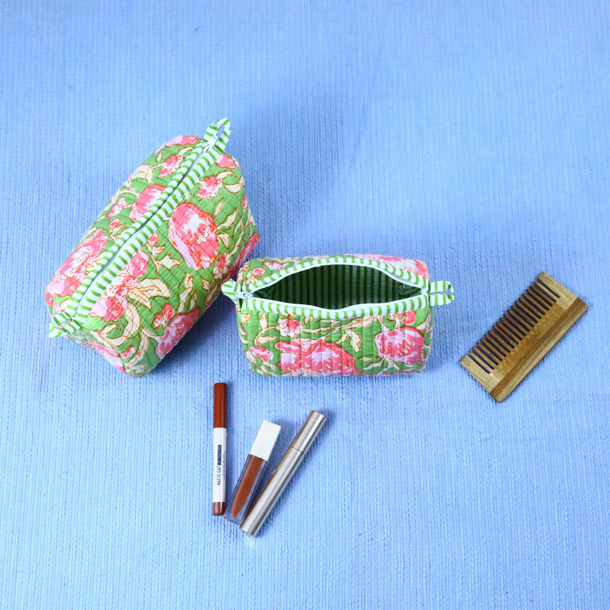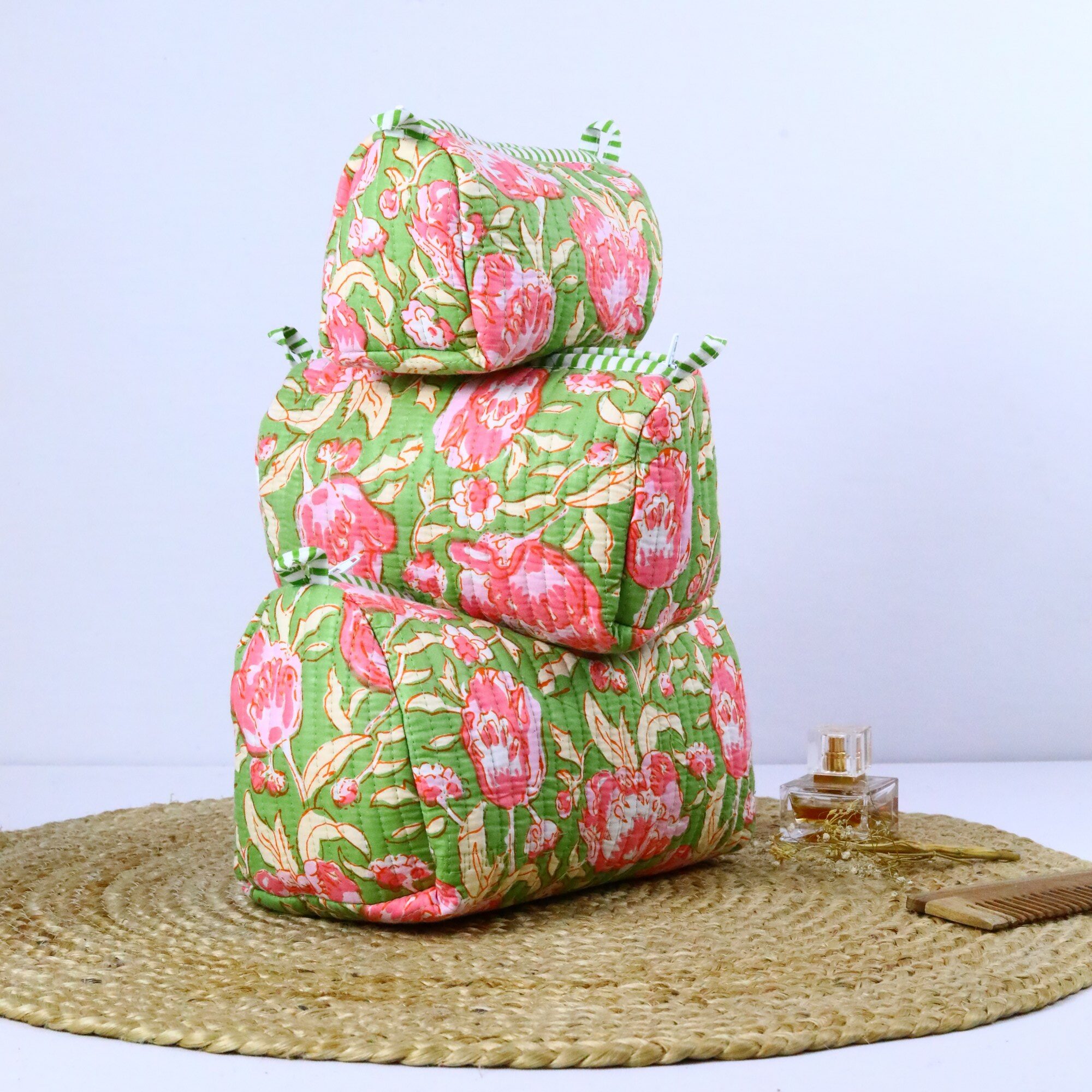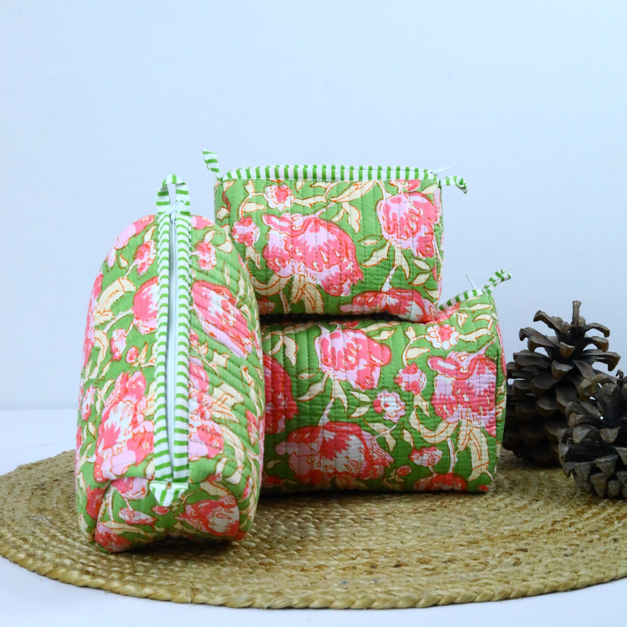 This charming set of 3 cotton quilted toiletry pouches is perfect for organizing your travel essentials in style. Each pouch is handcrafted with care, featuring a unique block printed design that adds a touch of artistry to your travels. These pouches will add a touch of elegance and practicality to their adventures. A thoughtful and lasting gift that reflects your care and appreciation.
