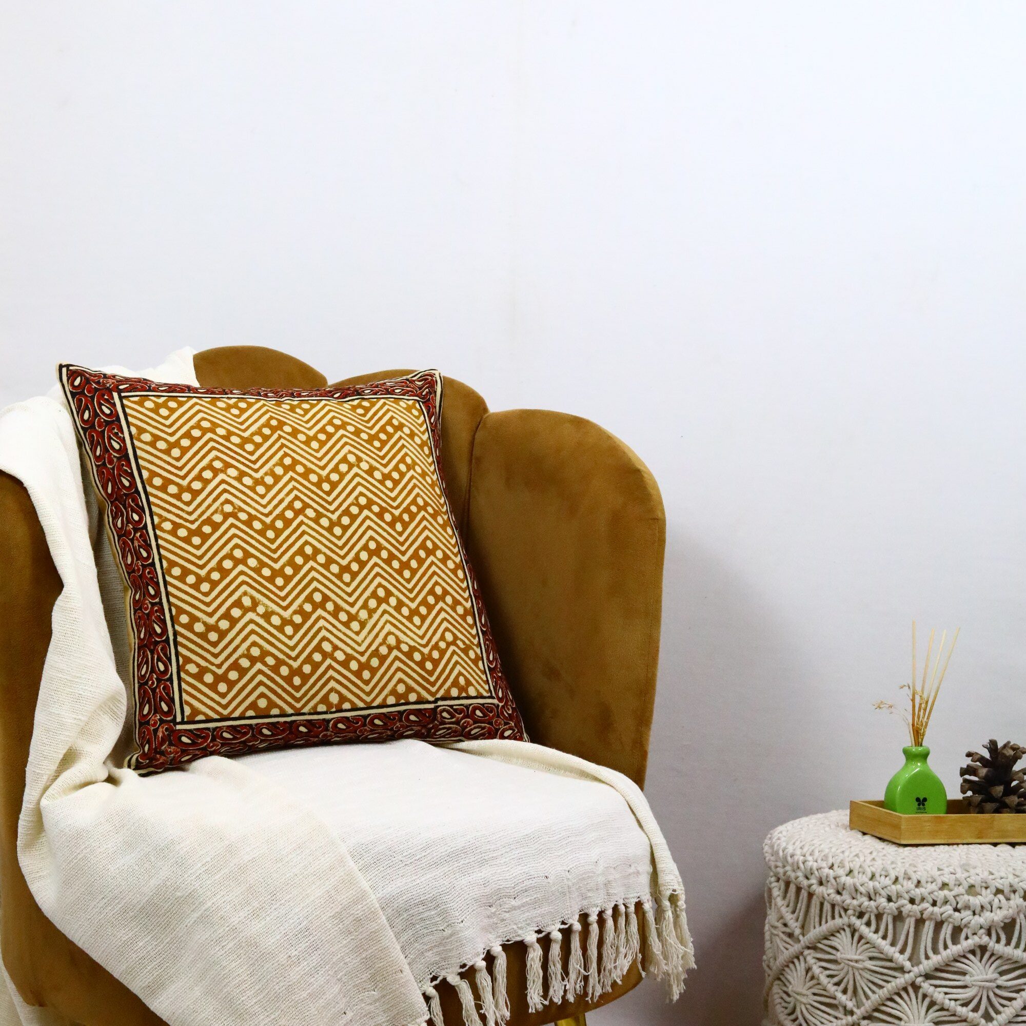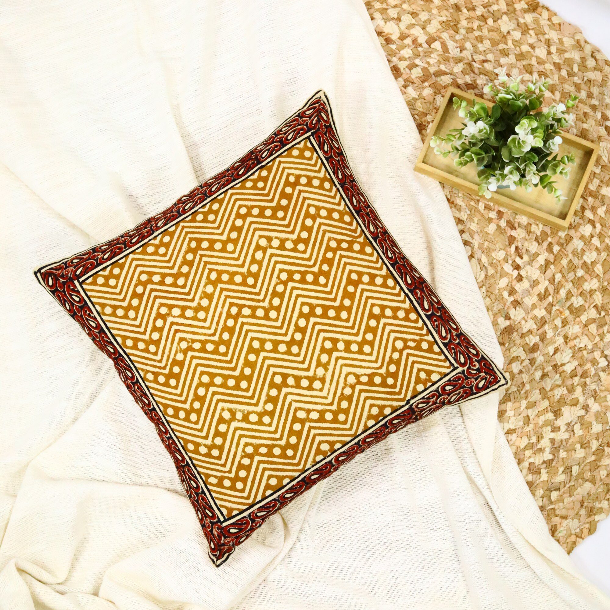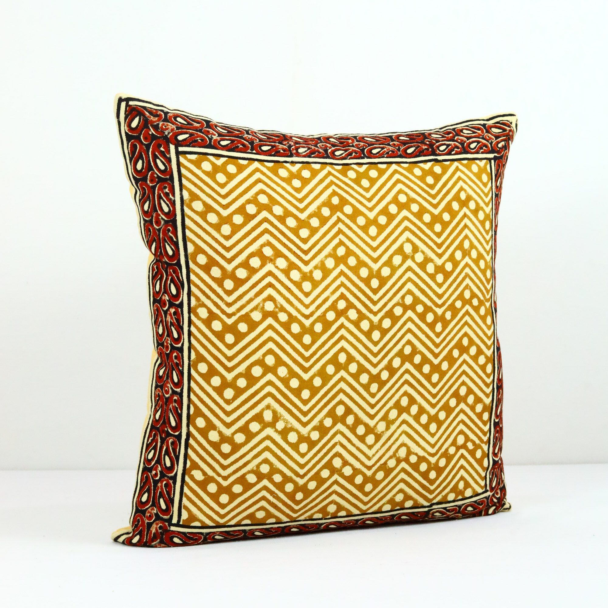 Be the first to review “Heritage Bagru Syahi Begar Block Printed Cushion Cover In Yellow & Red”