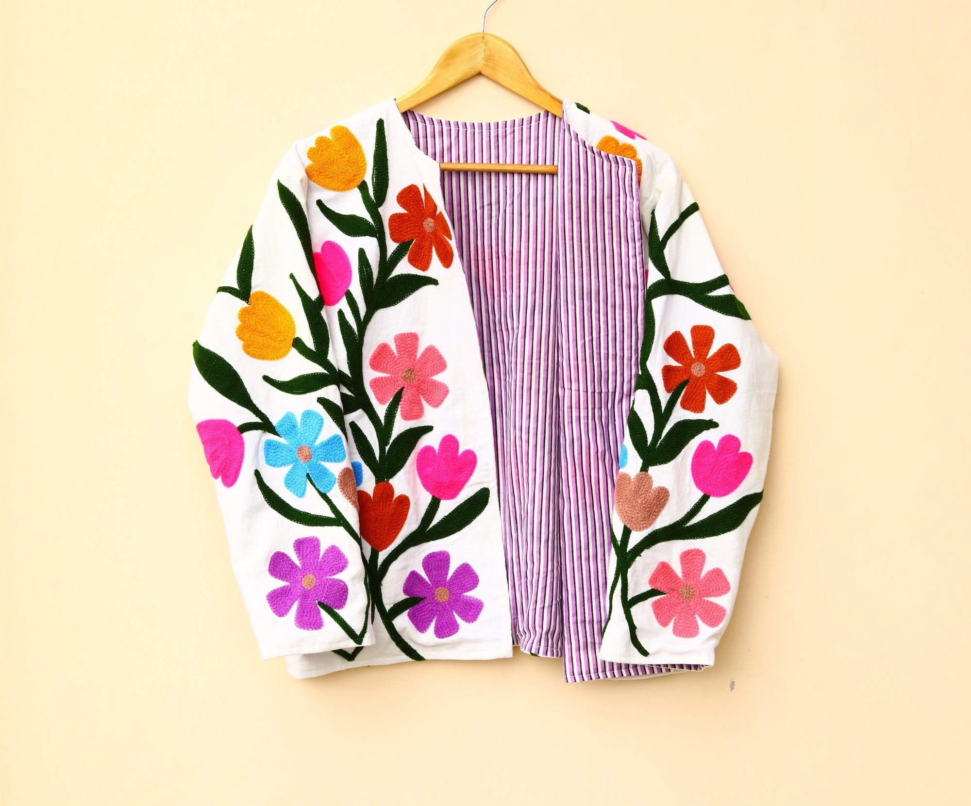 Experience the beauty and versatility of this Suzani embroidered kimono-style Urbek jacket.