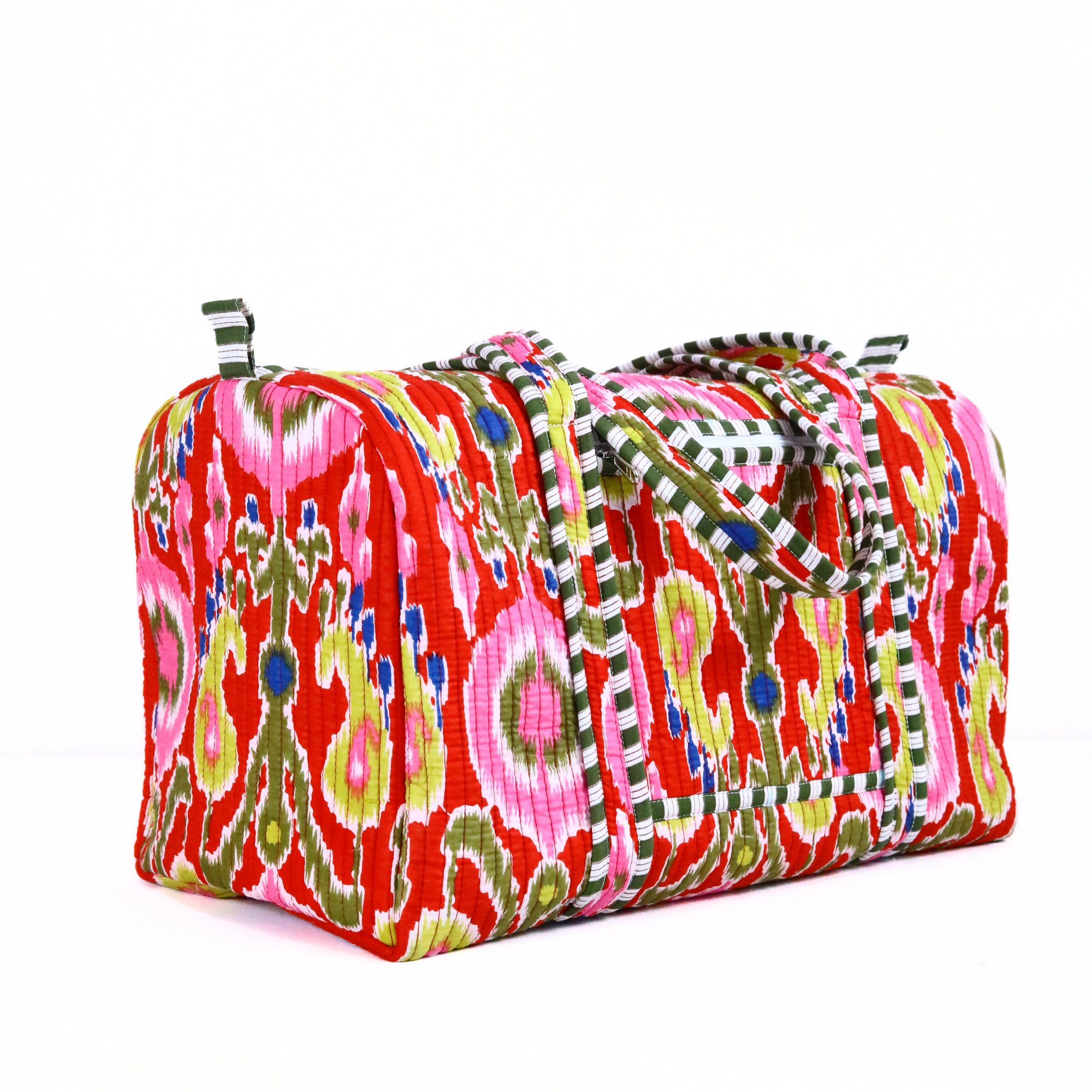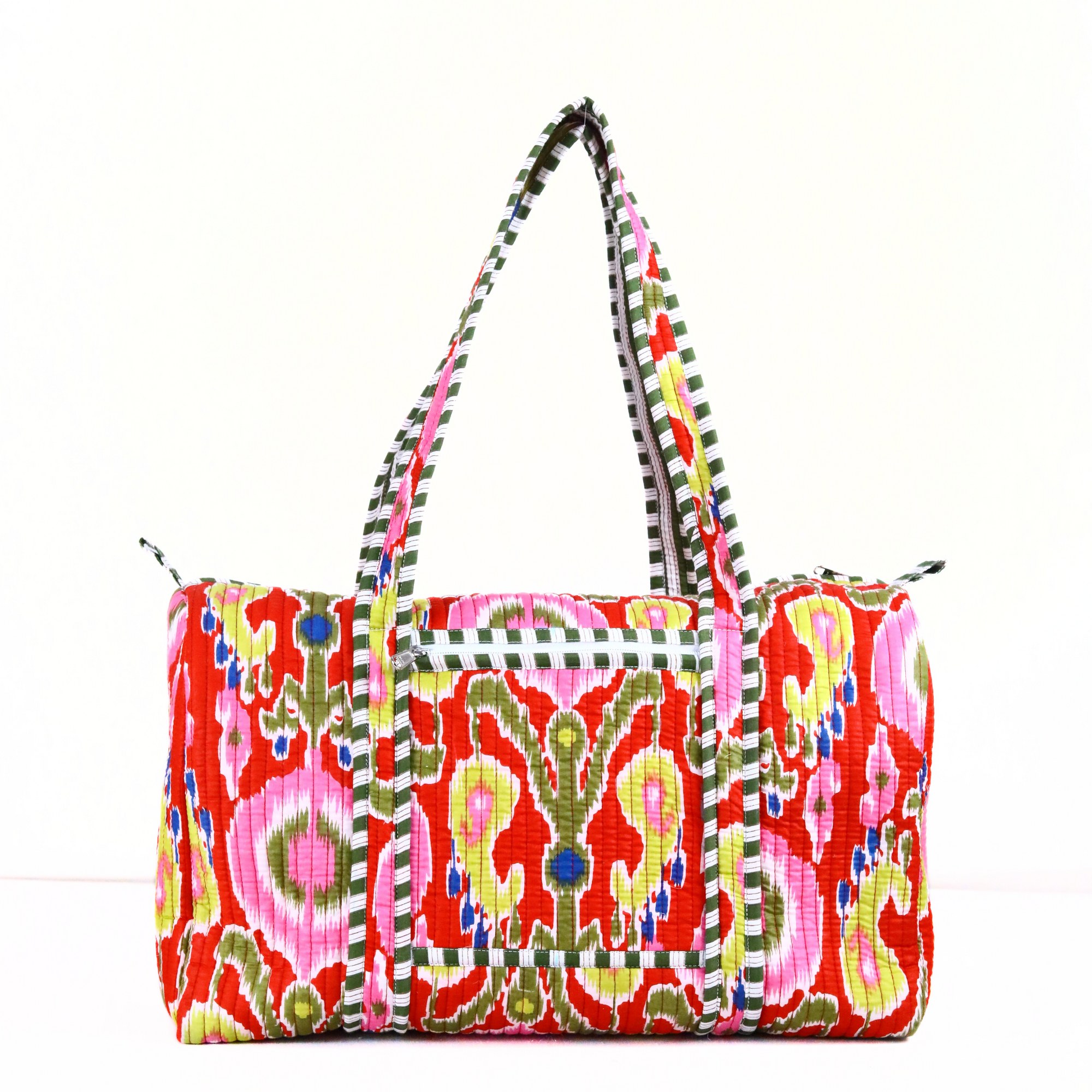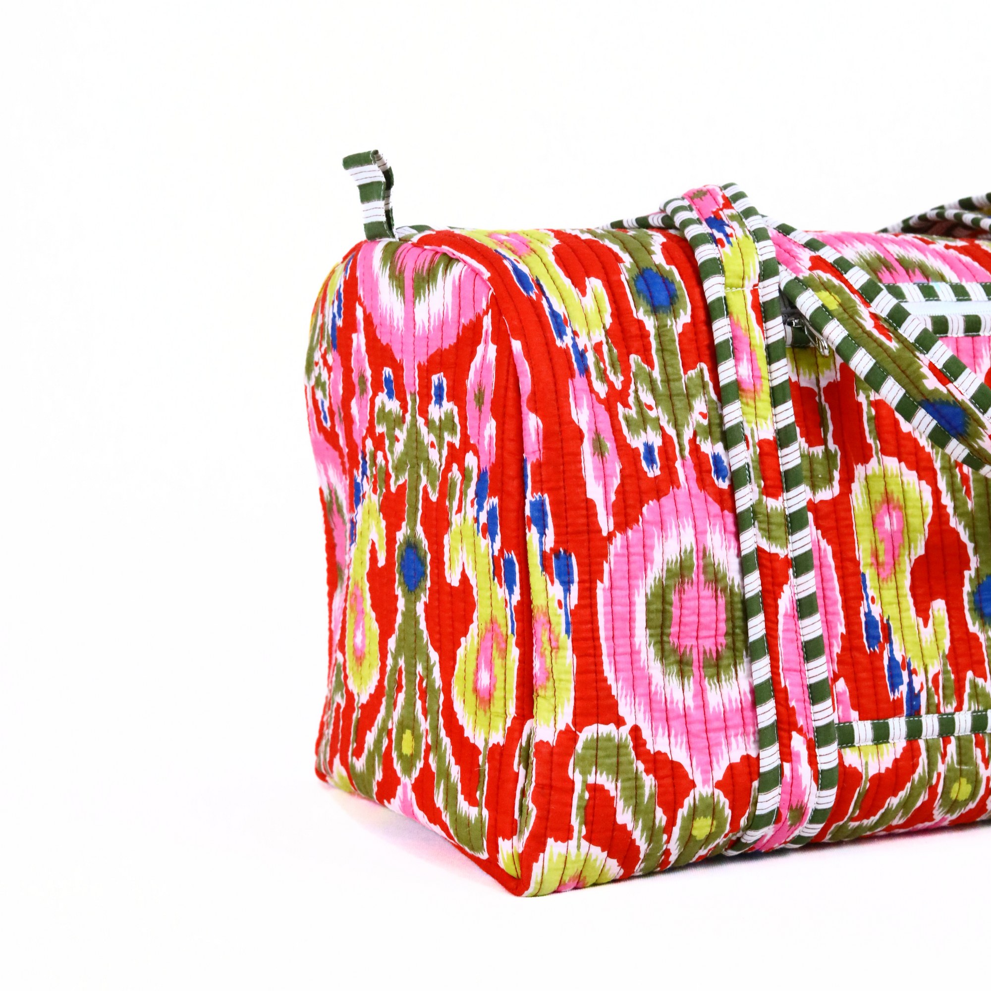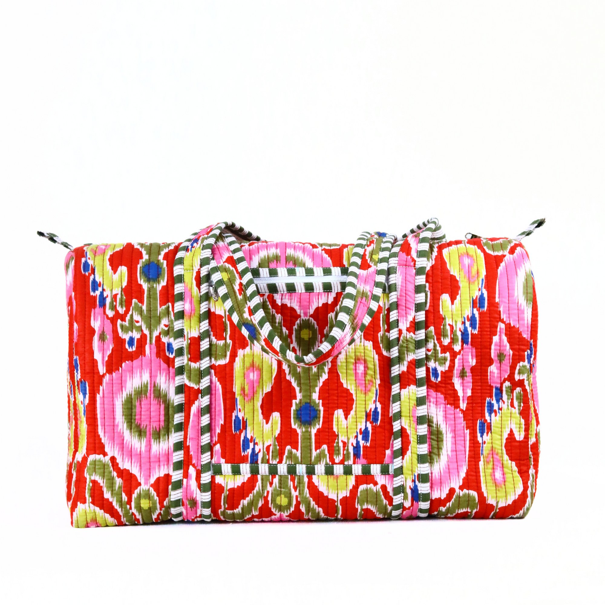 Elevate Your Adventures with Our Florals Duffle Carry Bag: Carry a Piece of Tradition Wherever You Roam and Exquisite Textiles. Unveiling the Uniqueness of Print Duffle Bags, Where Every Design Tells a Story Screen printed duffle bags blend traditional craftsmanship with modern functionality. Crafted from 100 % cotton these unique bags showcase vibrant patterns, durability, and a distinctive aesthetic. Ideal for travel or everyday use, they feature spacious interiors, sturdy handles, for convenience. These Bags can be used as gym bags, yoga bags, travel bags, sports bags, carry bags, Handbags, unisex bags & multipurpose bags. These bags are handcrafted and hence, give a gorgeous overall look.
