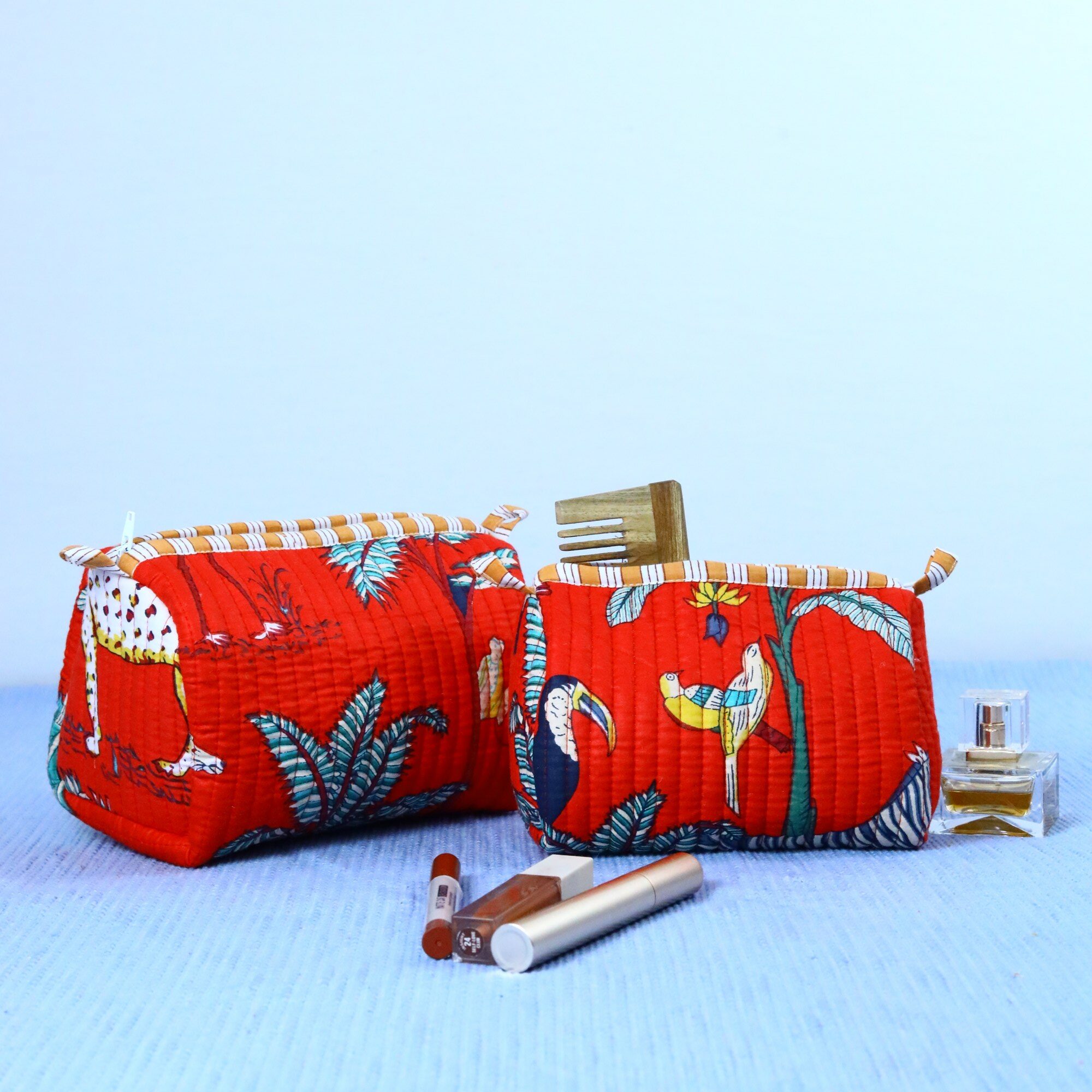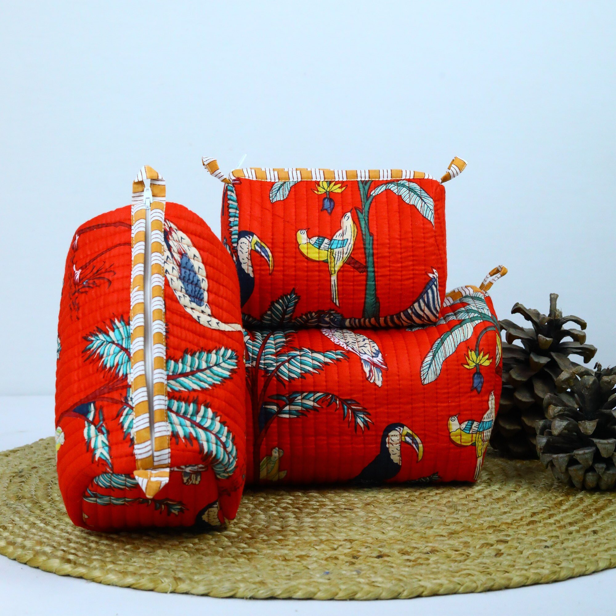 This charming set of 3 cotton quilted toiletry pouches is perfect for organizing your travel essentials in style. Each pouch is handcrafted with care, featuring a unique block printed design that adds a touch of artistry to your travels. These pouches will add a touch of elegance and practicality to their adventures. A thoughtful and lasting gift that reflects your care and appreciation.