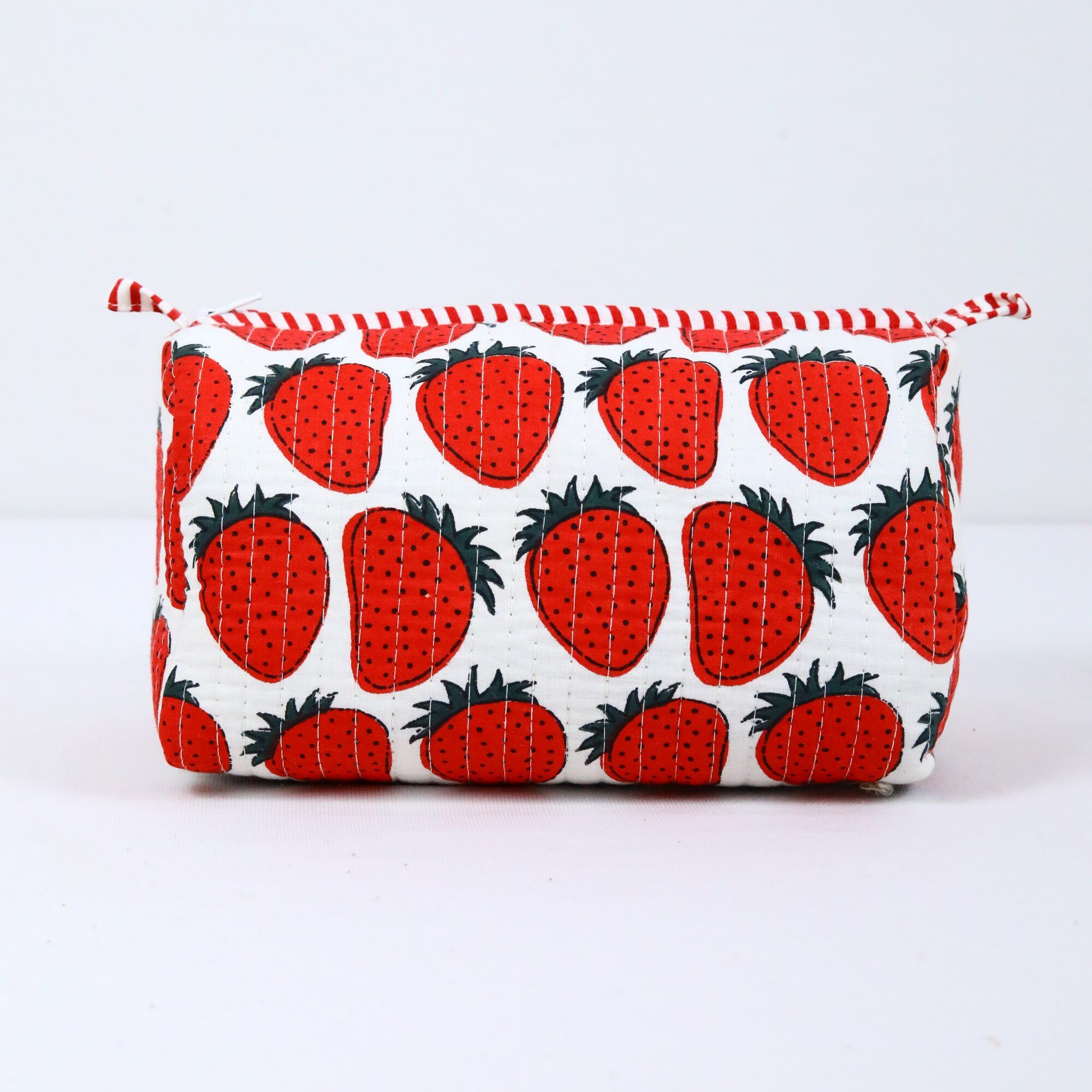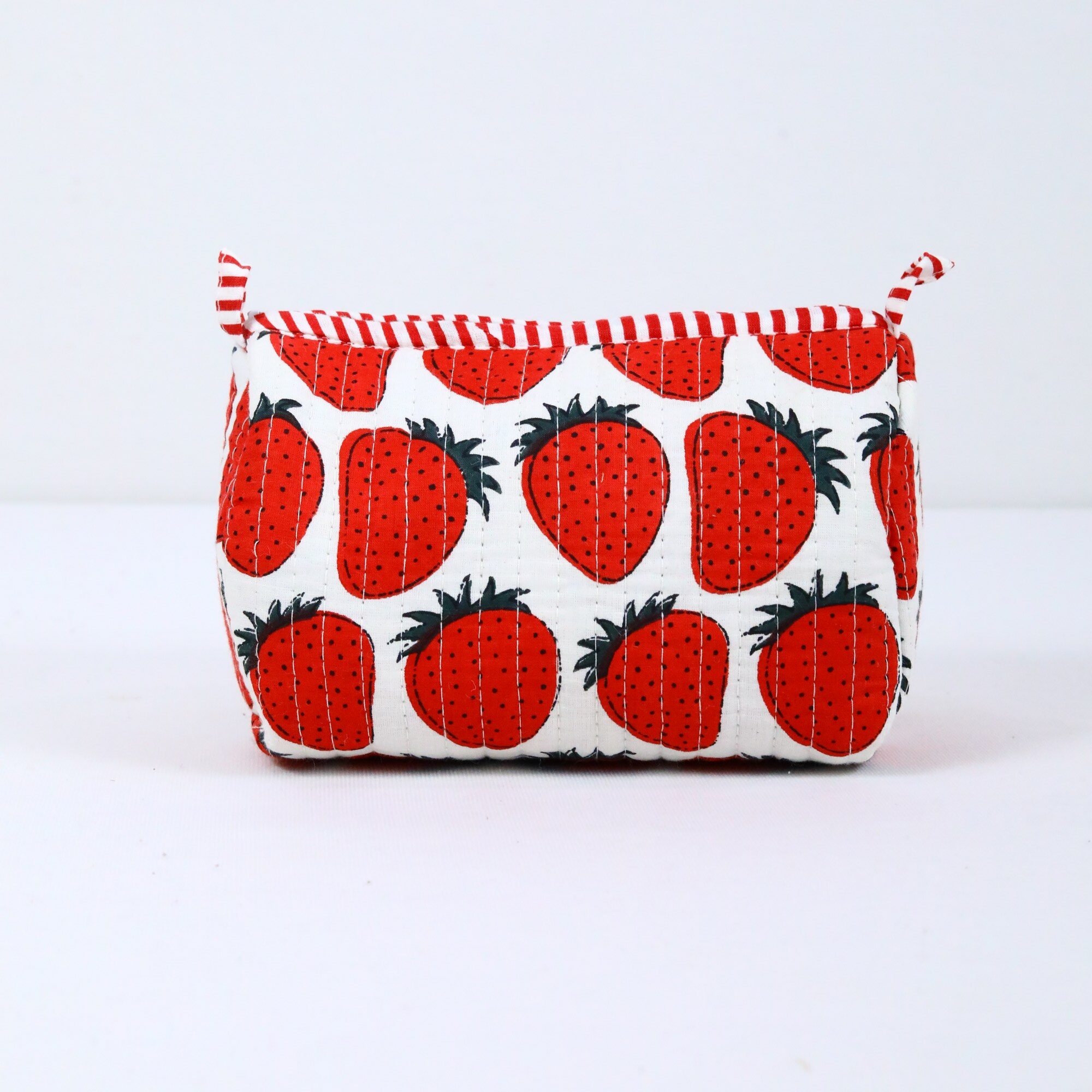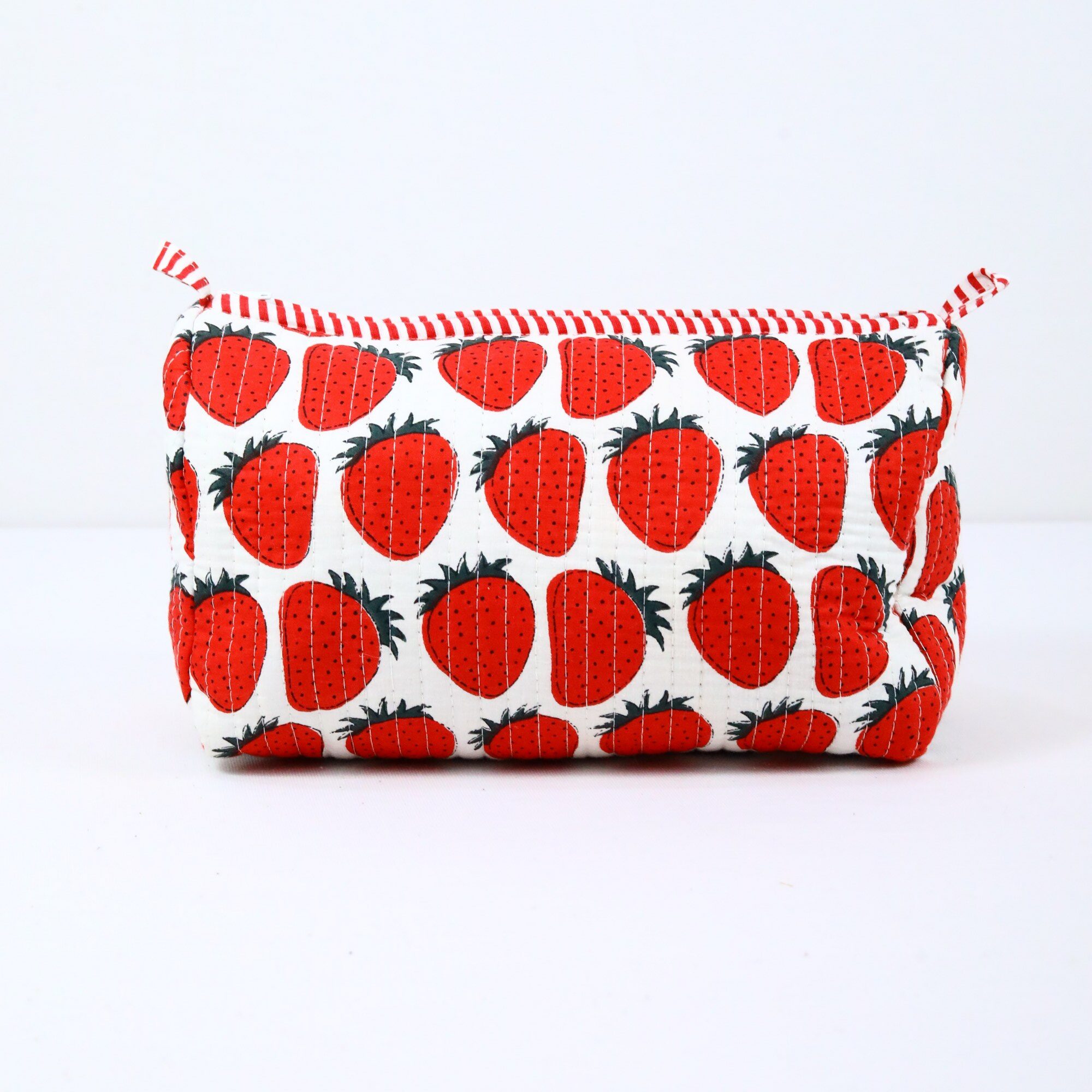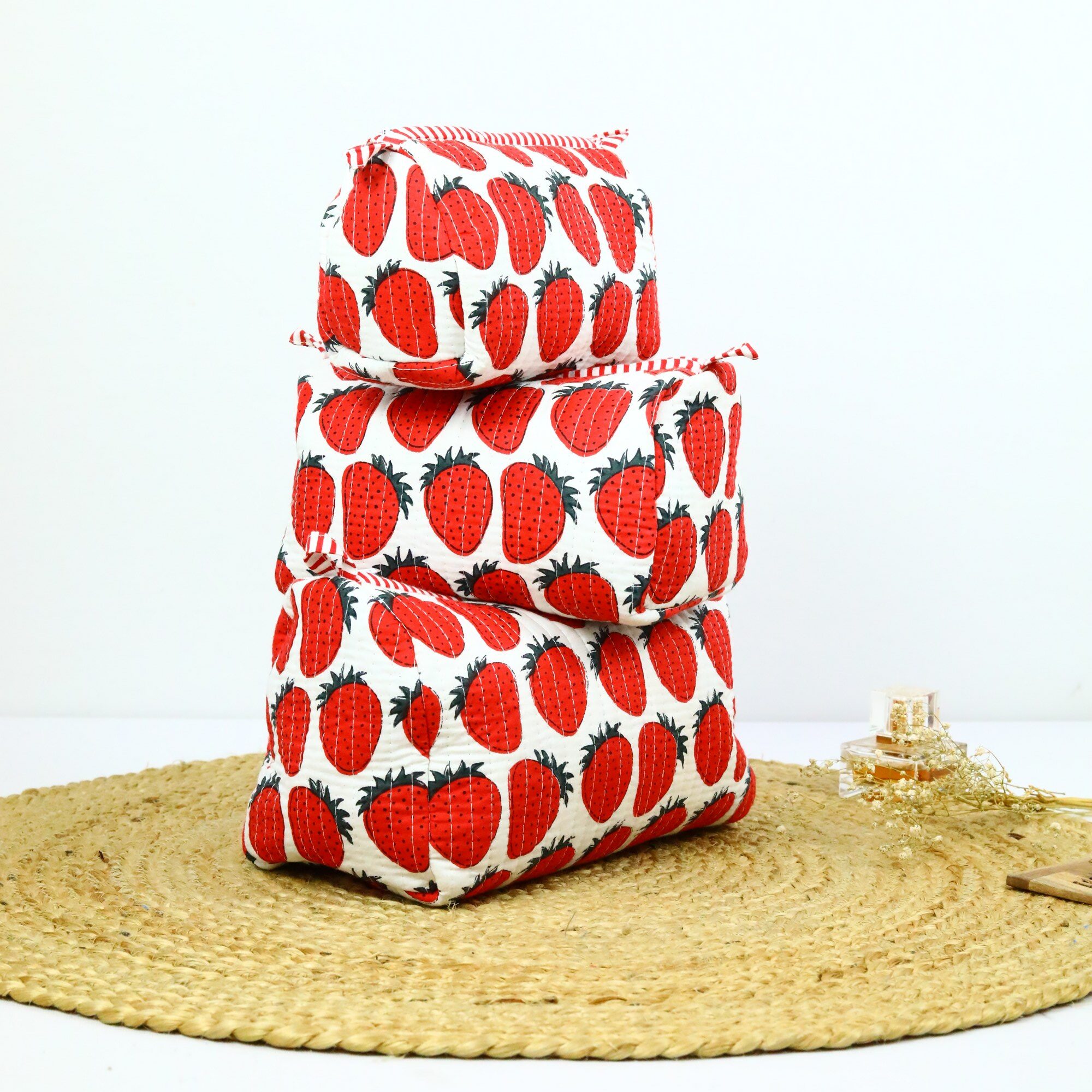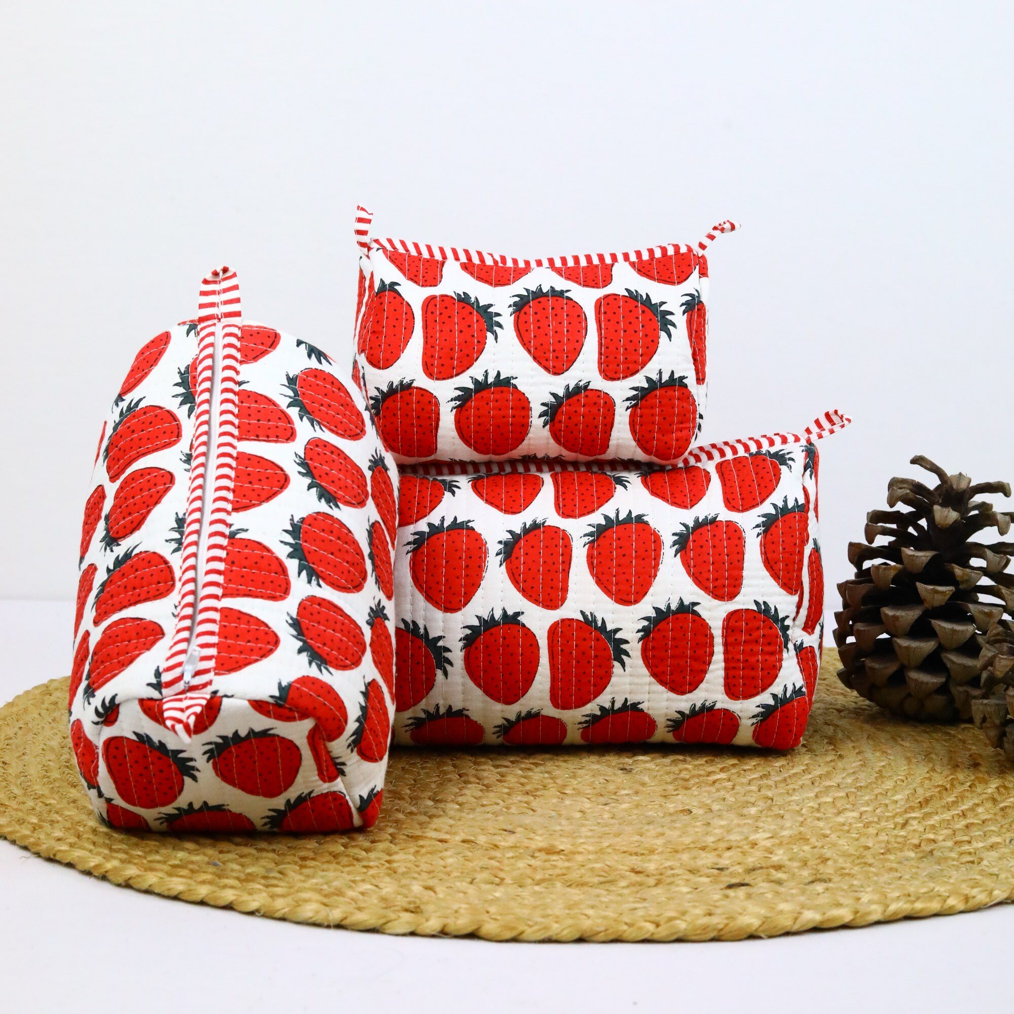 Be the first to review “Strawberry Design Screen Printed Set Of 3 Cotton Quilted Toiletry Pouches in Red”
