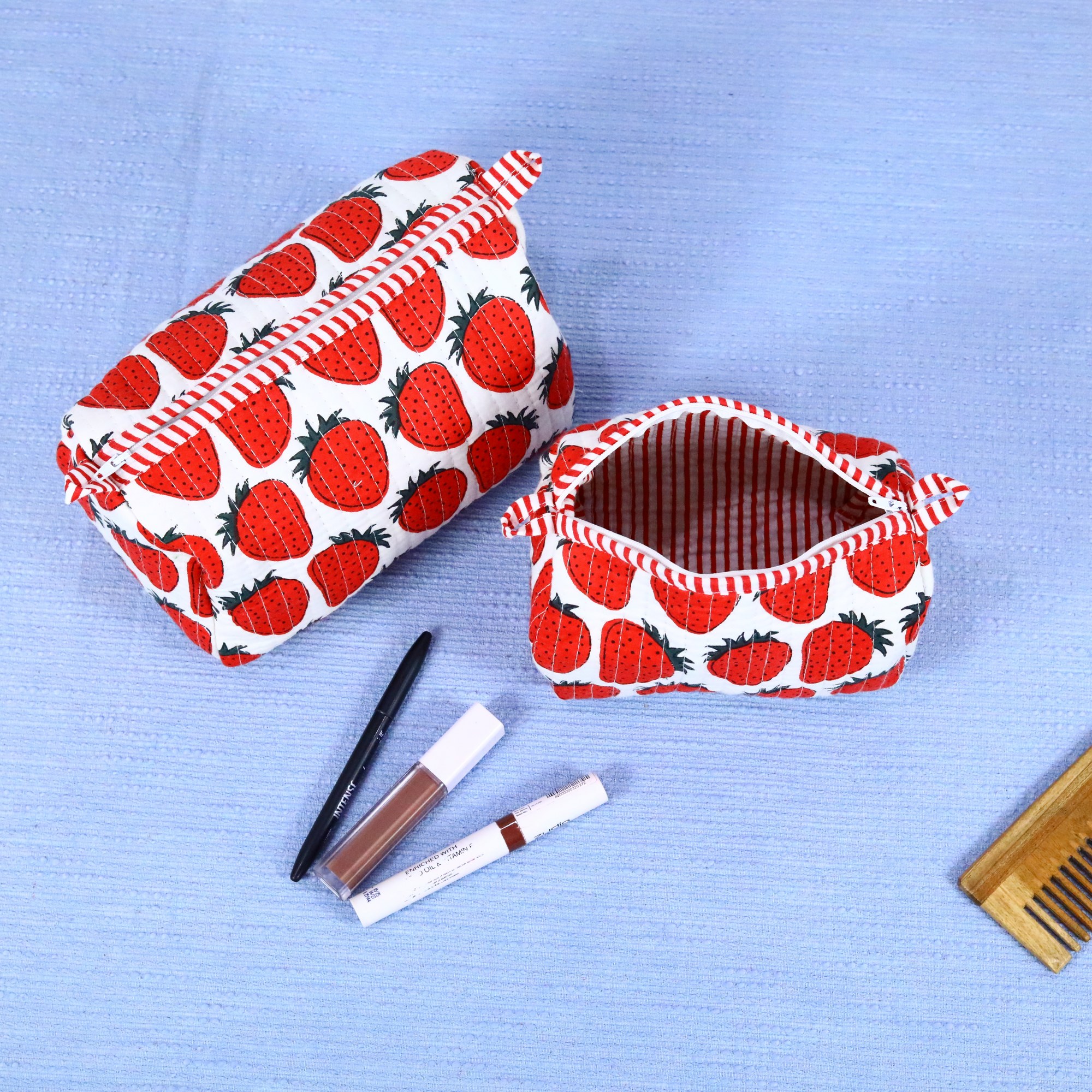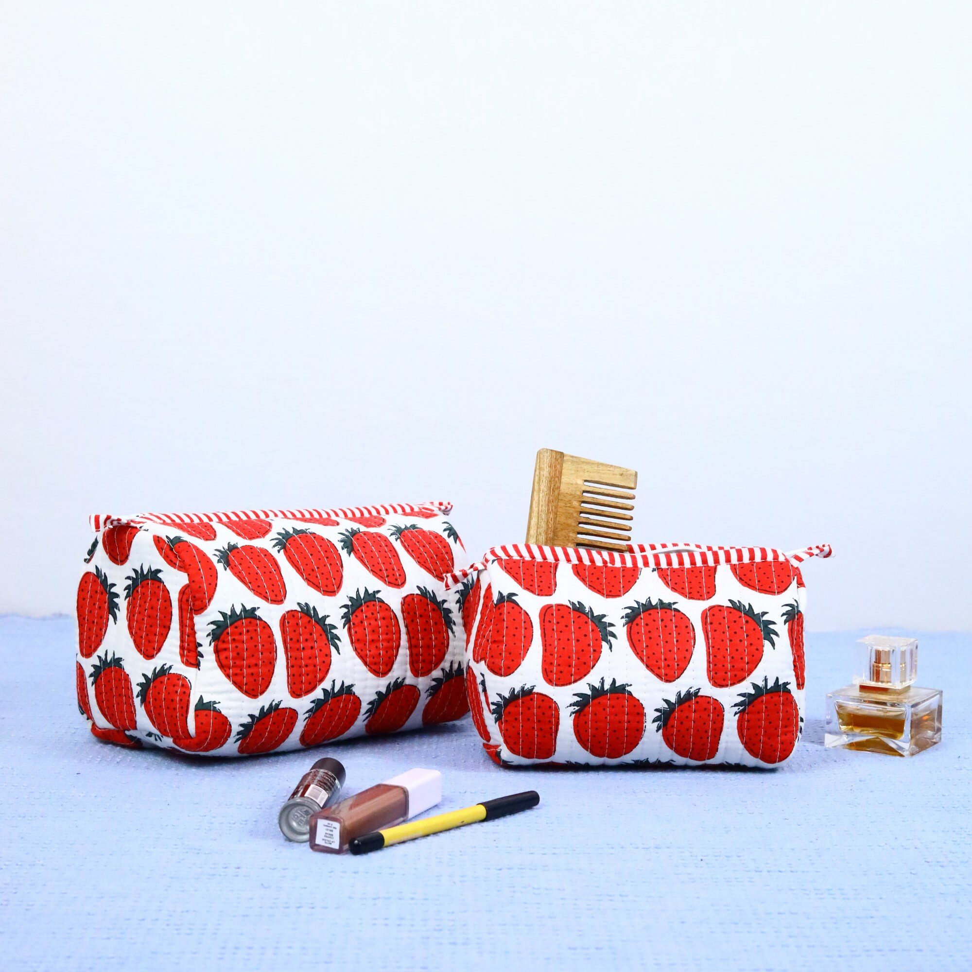 Strawberry Design Screen Printed Set Of 3 Cotton Quilted Toiletry Pouches in Red