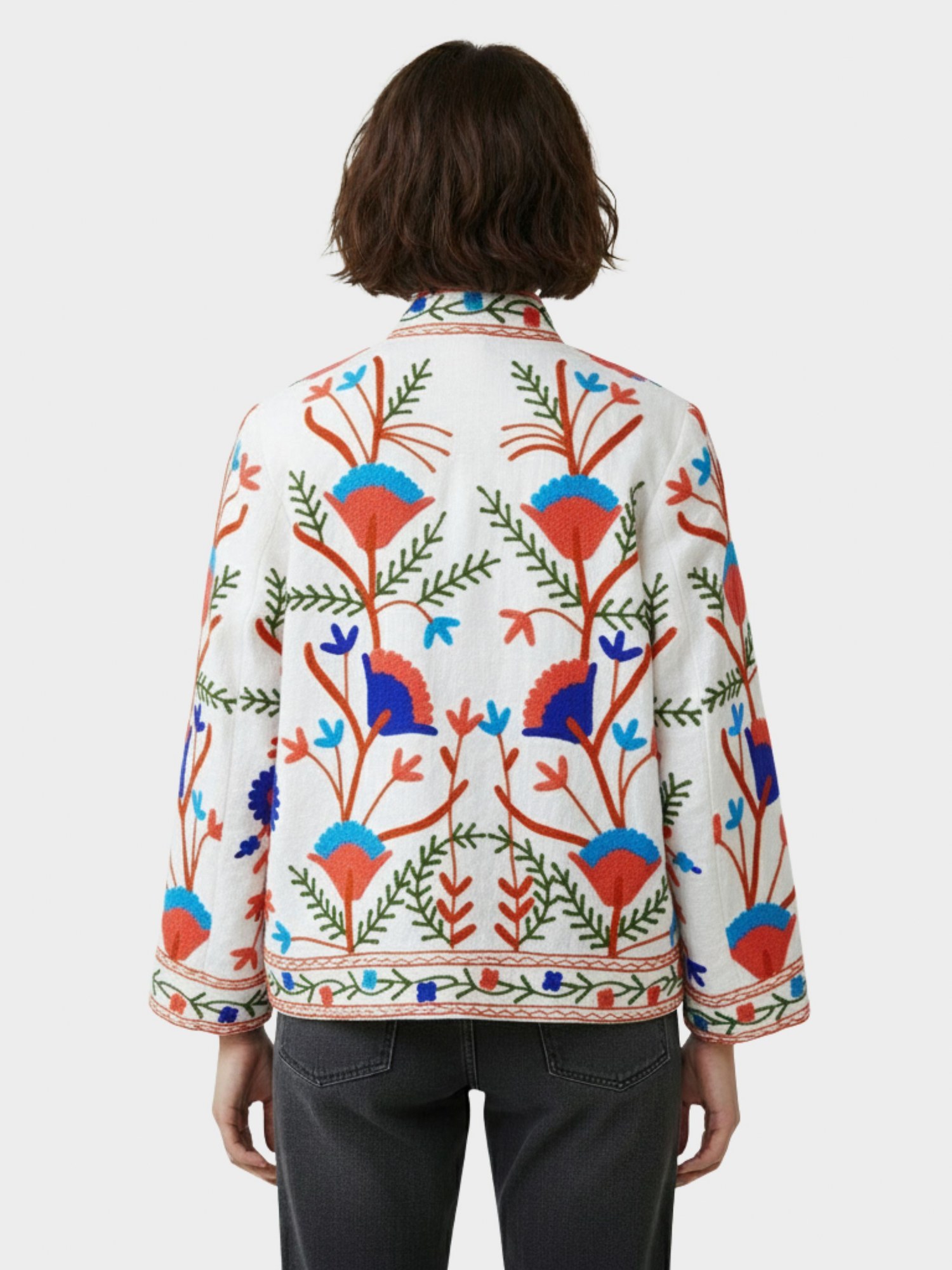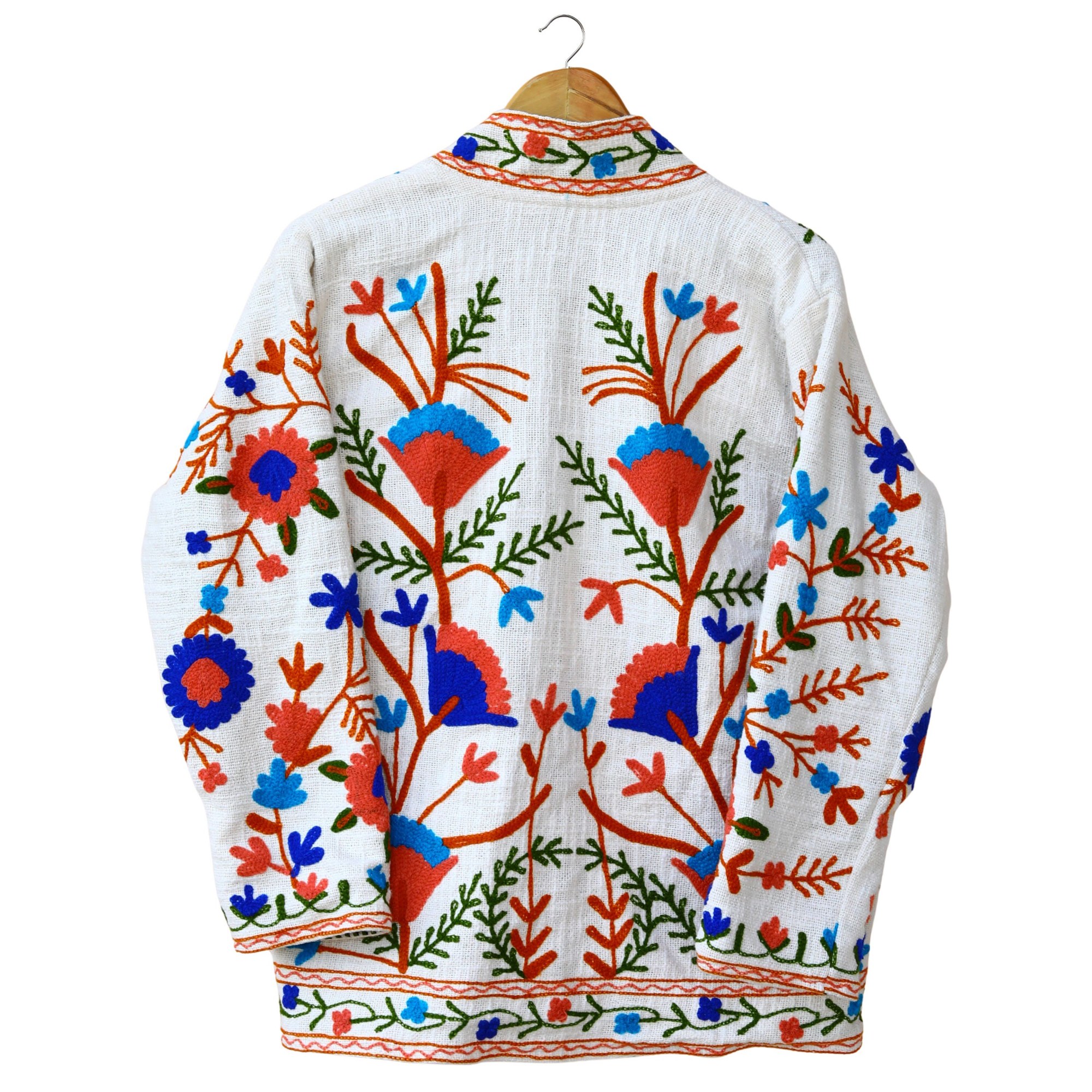 Experience the beauty and versatility of this Suzani embroidered kimono-style Urbek jacket.