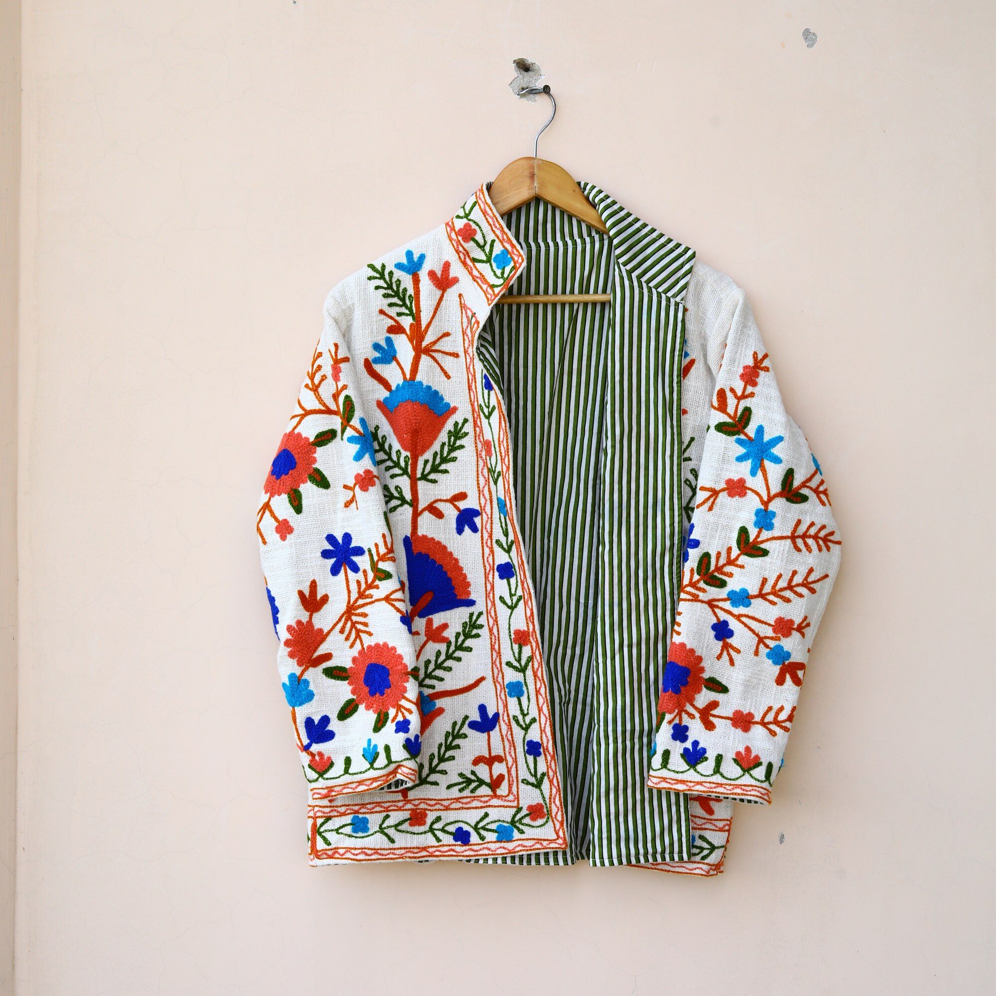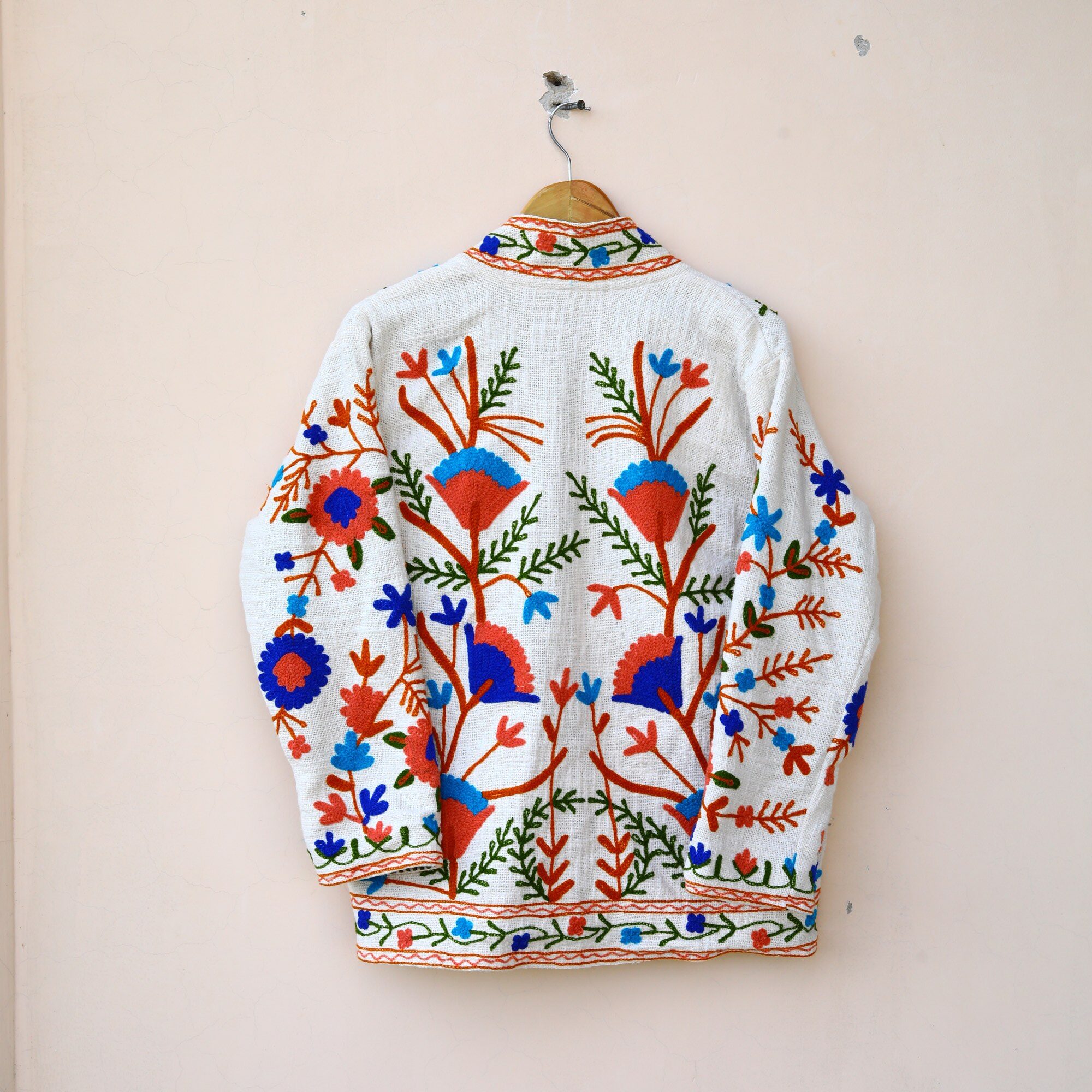 Embrace timeless elegance with this stunning Suzani embroidered kimono-style Urbek jacket. Crafted with intricate Suzani embroidery, a traditional Uzbek textile known for its vibrant colours and bold patterns, this jacket is a true work of art.