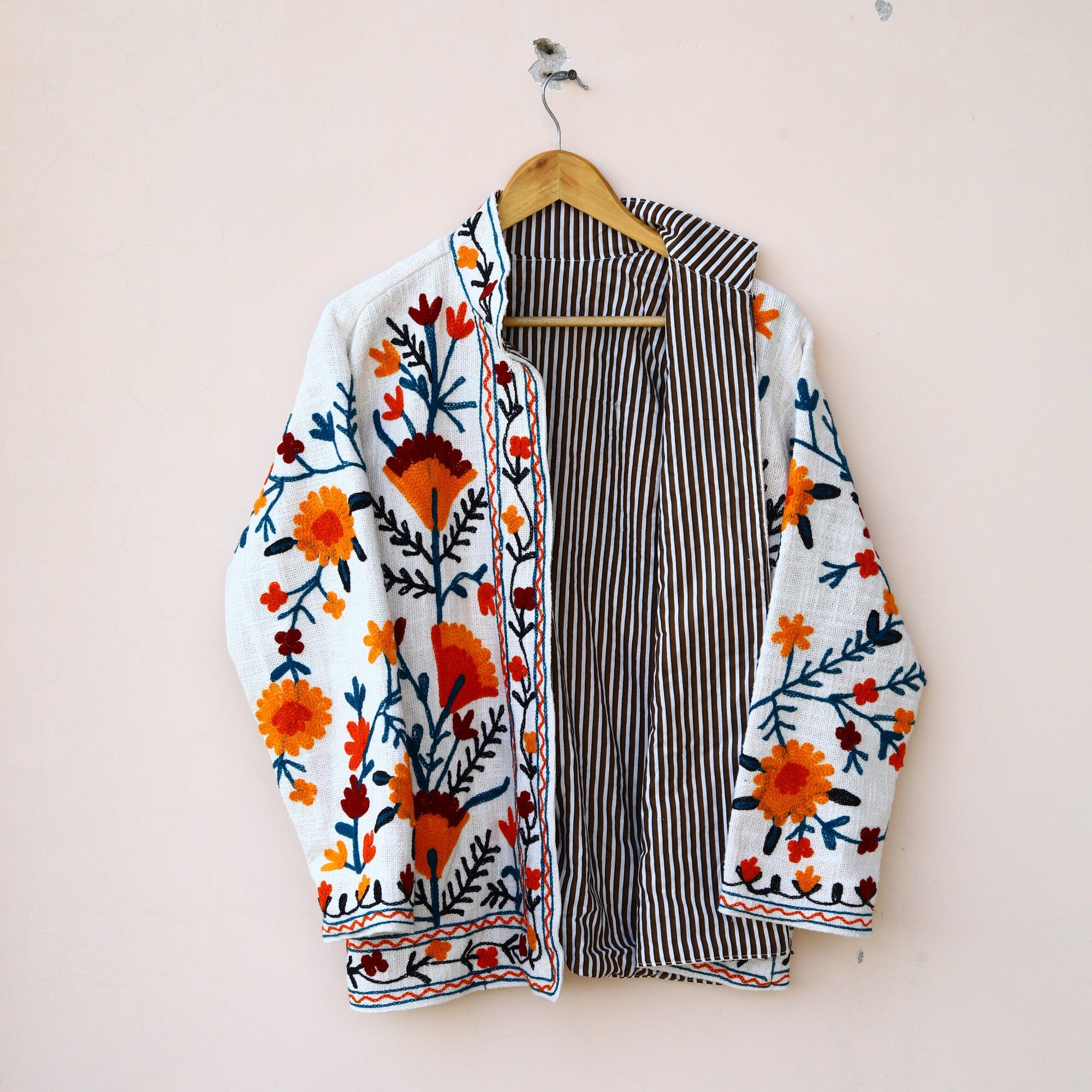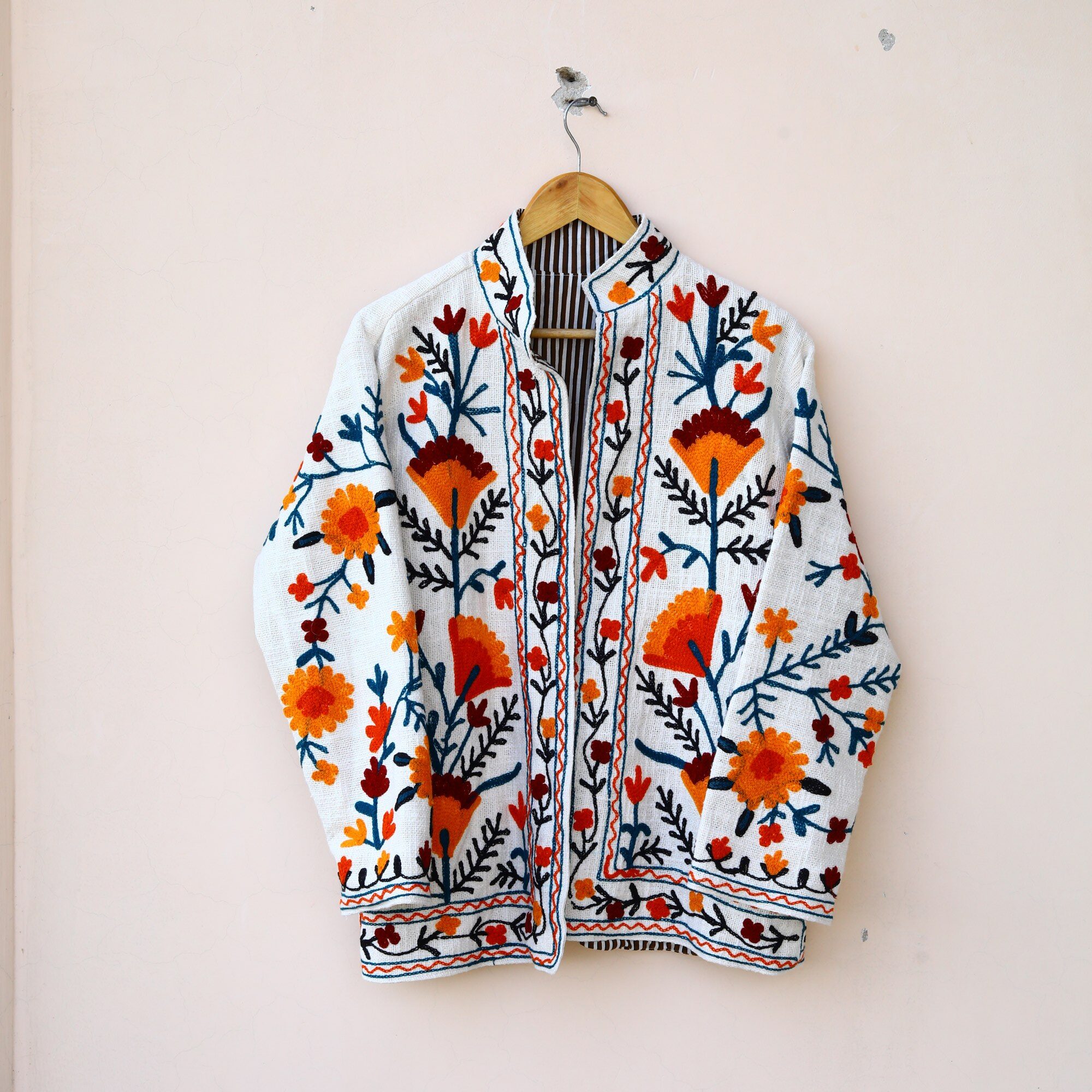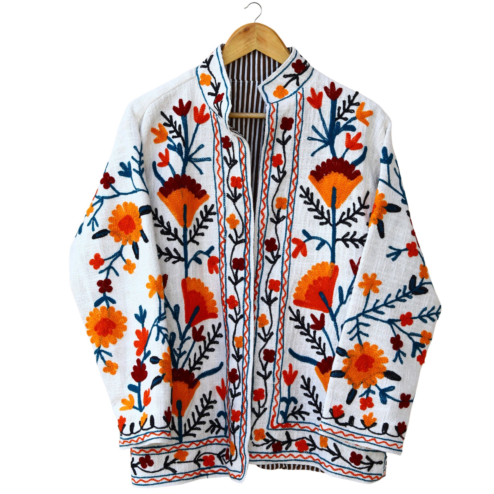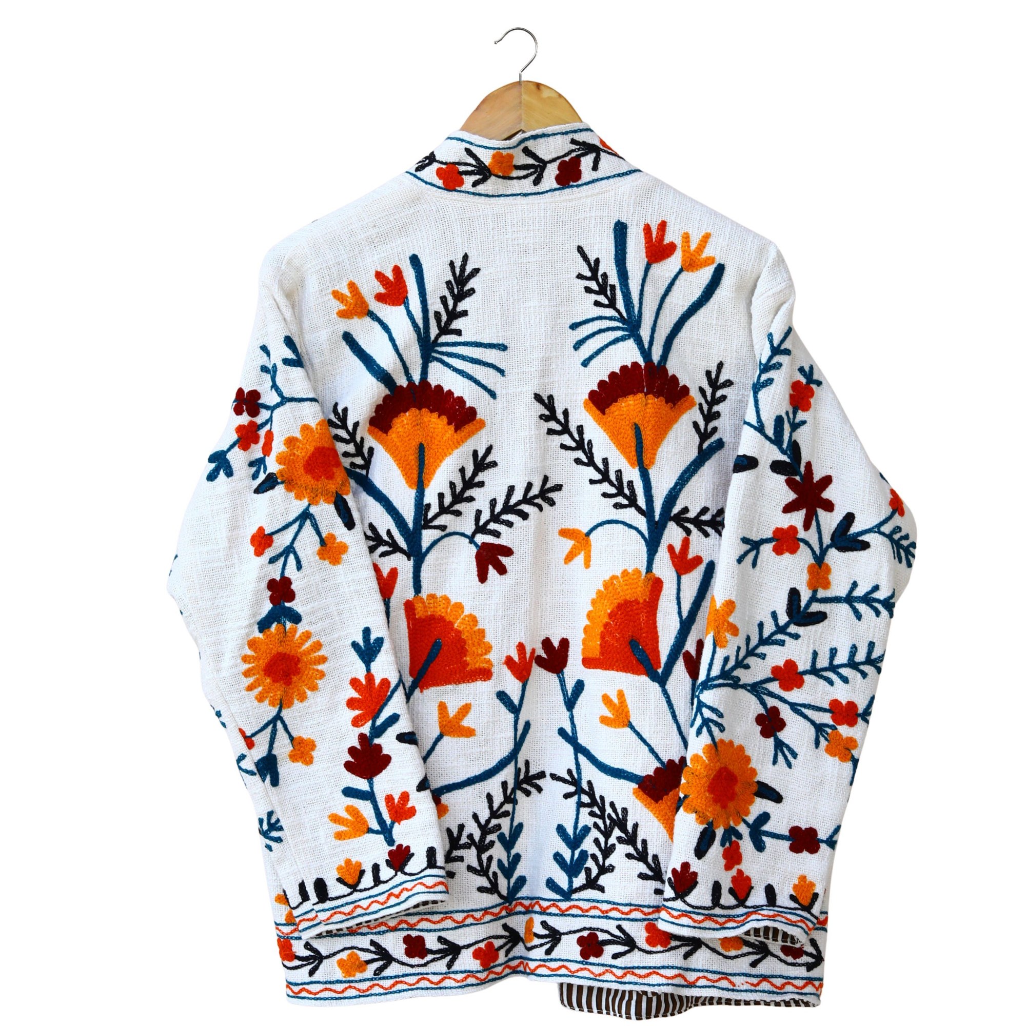 Embrace timeless elegance with this stunning Suzani embroidered kimono-style Urbek jacket. Crafted with intricate Suzani embroidery, a traditional Uzbek textile known for its vibrant colours and bold patterns, this jacket is a true work of art.