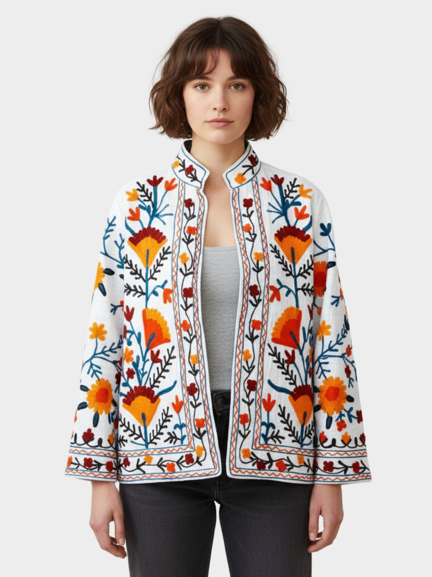 Experience the beauty and versatility of this Suzani embroidered kimono-style Urbek jacket.