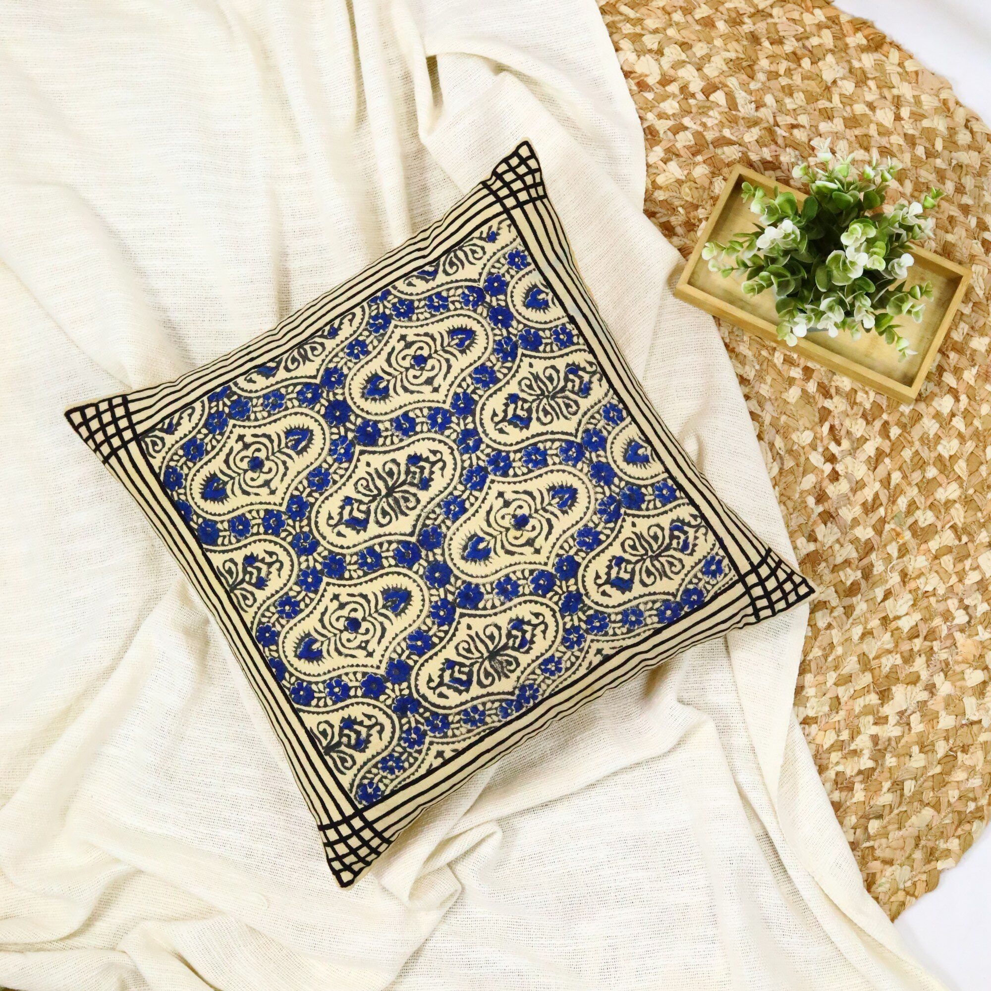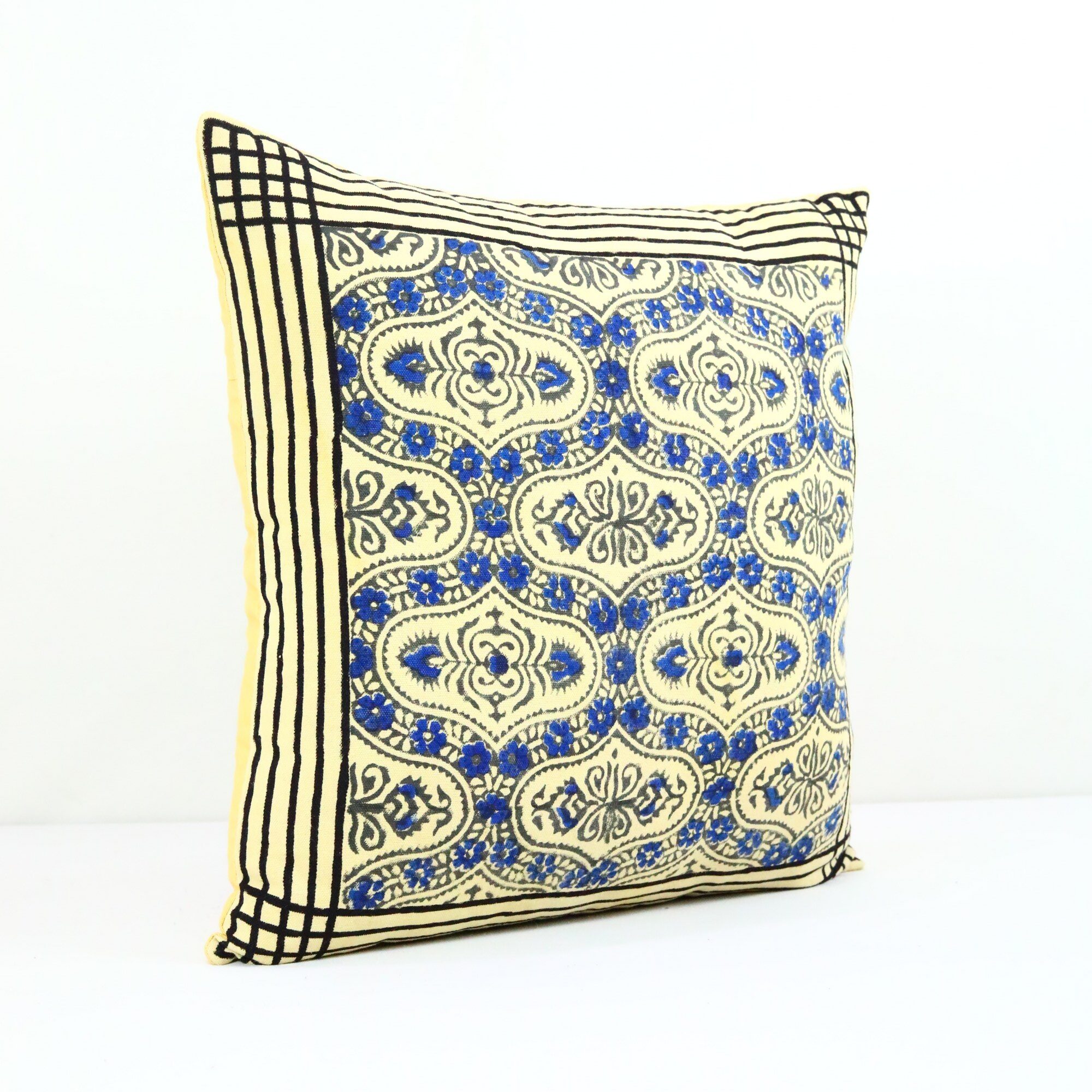 Traditional Syahi Begar Block Printed Cushion Cover In Blue & Multicolor
